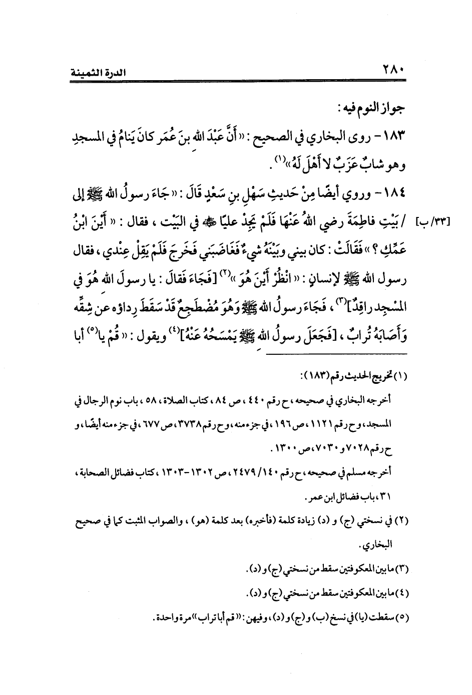 أخرجه البخاري في صحيحه، ح رقم ٤٤٠، ص ٨٤، كتاب الصلاة، ٥٨، باب نوم الرجال في المسجد، و ح رقم ١١٢١، ص ١٩٦، في جزء منه، و ح رقم ٣٧٣٨، ص ٦٧٧، في جزء منه أيضًا، و ح رقم ٧٠٢٨ و ٧٠٣٠، ص ١٣٠٠.