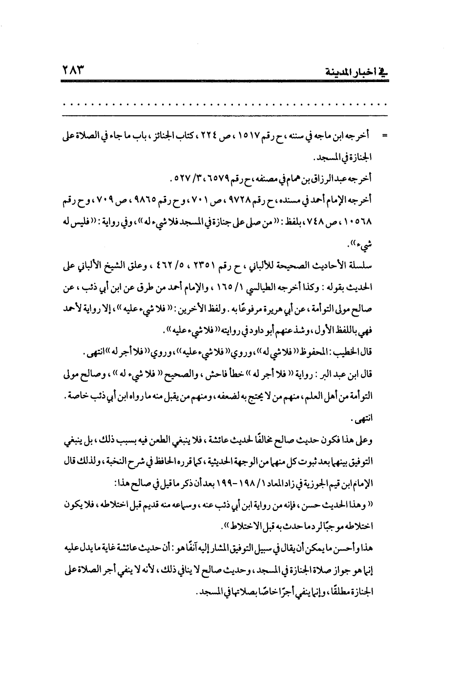 هذا وأحسن ما يمكن أن يقال في سبيل التوفيق المشار إليه آنفًا هو: أن حديث عائشة غاية ما يدل عليه إنما هو جواز صلاة الجنازة في المسجد، وحديث صالح لا ينافي ذلك، لأنه لا ينفي أجر الصلاة على الجنازة مطلقًا، وإنما ينفي أجرًا خاصًا بصلاتها في المسجد.