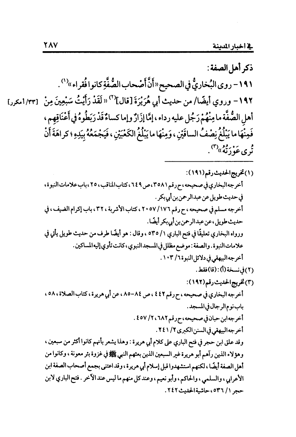 ١٩١ - روى البُخاريُّ في الصحيح ((أَنَّ أَصْحاب الصُّفَّةِ كانوا فُقراء)) (¬١).