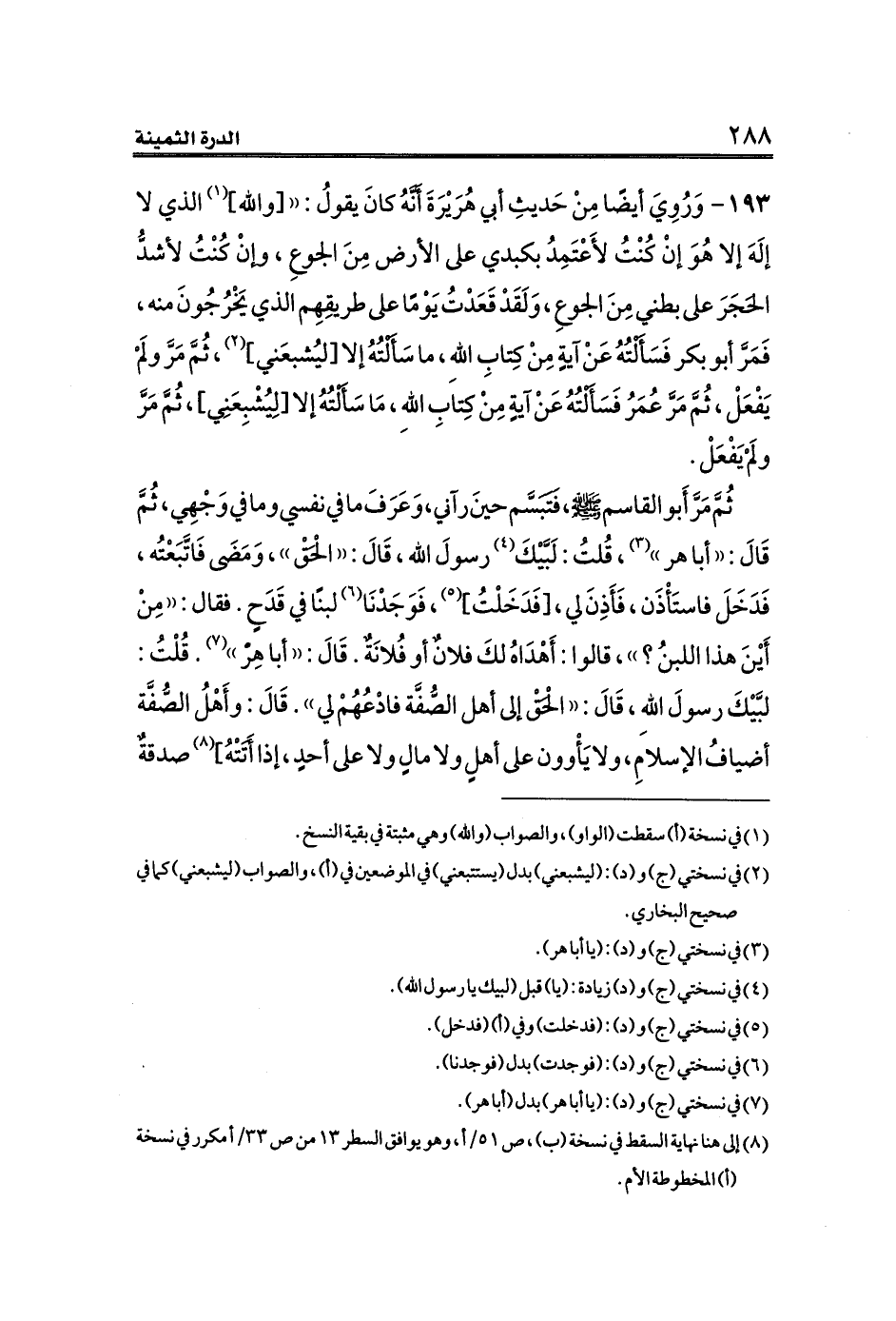 ١٩٣ - وَرُوِيَ أيضًا مِنْ حَديثِ أبي هُرَيْرَةَ أَنَّهُ كانَ يقولُ: (([والله] (¬١) الذي لا إلَهَ إلا هُوَ إنْ كُنْتُ لأَعْتَمِدُ بكبدي على الأرض مِنَ الجوعِ، وإنْ كُنْتُ لأشدُّ الحَجَرَ على بطني مِنَ الجوعِ، وَلَقَدْ قَعَدْتُ يَوْمًا على طريقِهِم الذي يَخْرُجُونَ منه، فَمَرَّ أبو بكر فَسَأَلْتُهُ عَنْ آيةٍ مِنْ كِتابِ اللهِ، ما سَأَلْتُهُ إلا [ليُشبعَني] (¬٢)، ثُمَّ مَرَّ ولَمْ يَفْعَلْ، ثُمَّ مَرَّ عُمَرُ فَسَأَلْتُهُ عَنْ آيةٍ مِنْ كِتابِ اللهِ، مَا سَأَلْتُهُ إلا [لِيُشْبِعَنِي]، ثُمَّ مَرَّ ولَمْ يَفْعَلْ.