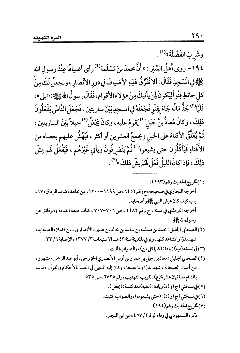 ١٩٤ - روى أَهلُ السِّيَر: ((أَنَّ محمدَ بنَ مَسْلَمة (¬٢) رأى أضيافًا عِنْدَ رسولِ اللهِ - صلى الله عليه وسلم -في المَسْجِدِ فَقَالَ: ألا نُفَرِّقُ هَذِهِ الأضيافَ في دورِ الأنْصارِ، ونجعلُ لَكَ مِنْ كلِ حائطٍ قِنْواً لِيَكونَ لِمَنْ يأتيكَ مِنْ هؤلاء الأقوام، فَقَالَ رسولُ الله صلى الله عليه وسلم: ((بلى))، فَلمَّا (¬٣) جَذَّ مَالُه جَاءَ بِقِنْوٍ فَجَعَلَهُ في المسجِدِ بَيْنَ ساريتين، فَجَعَلَ النَّاسُ يَفْعَلُونَ ذلِكَ، وكانَ مُعاذُ بنُ جَبَلٍ (¬٤) يَقومُ عليه، وكانَ يَجْعَلُ (¬٥) حبلاً بَيْنَ الساريتين، ثُمَّ يُعَلَّقُ الأقناءَ على الحبلِ ويجمعُ العشرين أو أكثر، فَيَهُشُ عليهم بعصاه من الأَقْناءِ فَيَأْكُلُون حتى يشبعوا (¬٦) ثُمَّ يَنْصَرِفُونَ ويأتي غَيْرُهُم، فَيَفْعَلُ لَهم مِثلَ ذلِكَ، فإذا كانَ الليلُ فَعَلَ لَهُمْ مِثْلَ ذلكَ)) (¬٧).