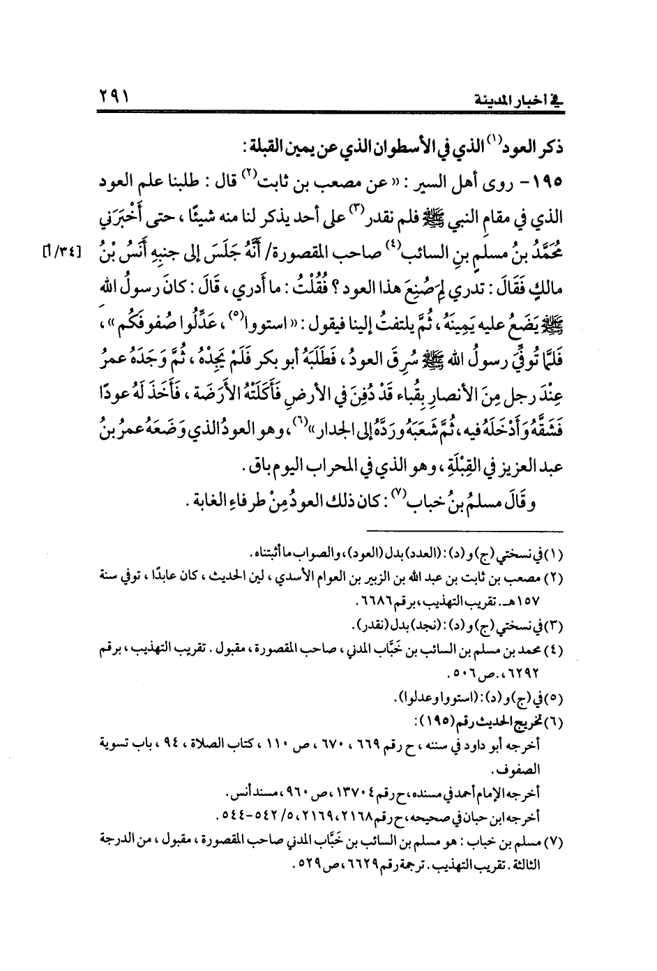 ١٩٥ - روى أهل السير: ((عن مصعب بن ثابت (¬٢) قال: طلبنا علم العود الذي في مقامِ النبي الله صلى الله عليه وسلم فلم نقدر (¬٣) على أحد يذكر لنا منه شيئًا، حتى أَخْبَرَني مُحَمَّدُ بنُ مسلمٍ بنِ السائب (¬٤) صاحب المقصورة [٣٤/أ] أَنَّهُ جَلَسَ إلى جنبِهِ أَنَسُ بْنُ مالكٍ فَقَالَ: تدري لِمَ صُنِعَ هذا العود؟ فُقُلْتُ: ما أَدري، قَالَ: كانَ رسولُ اللهِ - صلى الله عليه وسلم -يَضَعُ عليه يَمِينَهُ، ثُمَّ يلتفتُ إلينا فيقول: ((استووا (¬٥)، عَدِّلُوا صُفوفَكُم))، فَلمَّا تُوفِّيَ رسولُ الله صلى الله عليه وسلم سُرِقَ العودُ، فَطَلَبَهُ أبو بكر فَلَمْ يَجِدْهُ، ثُمَّ وَجَدَهُ عمرُ عِنْدَ رجل مِنَ الأنصارِ بِقُباء قَدْ دُفِنَ في الأرضِ فَأَكَلَتْهُ الأَرَضَة، فَأَخَذَ لَهُ عودًا فَشَقَّهُ وَأَدْخَلَهُ فيه، ثُمَّ شَعَبَهُ ورَدَّهُ إلى الجدار)) (¬٦)، وهو العودُ الذي وَضَعَهُ عمرُ بنُ عبد العزيز في القِبْلَةِ، وهو الذي في المحراب اليوم باق.