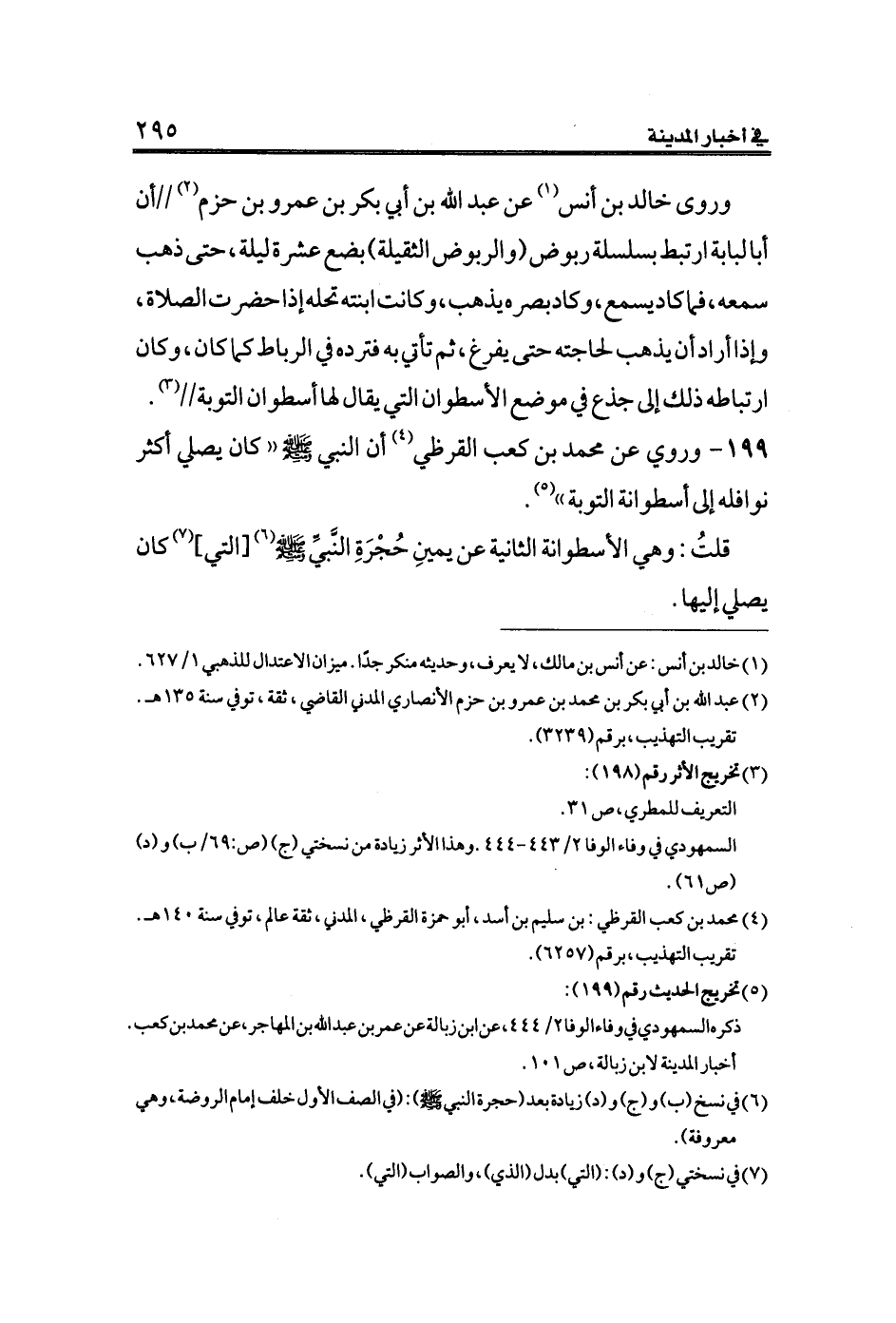 ١٩٩ - وروي عن محمد بن كعب القرظي (¬٤) أن النبي الله صلى الله عليه وسلم ((كان يصلي أكثر نوافله إلى أسطوانة التوبة)) (¬٥).