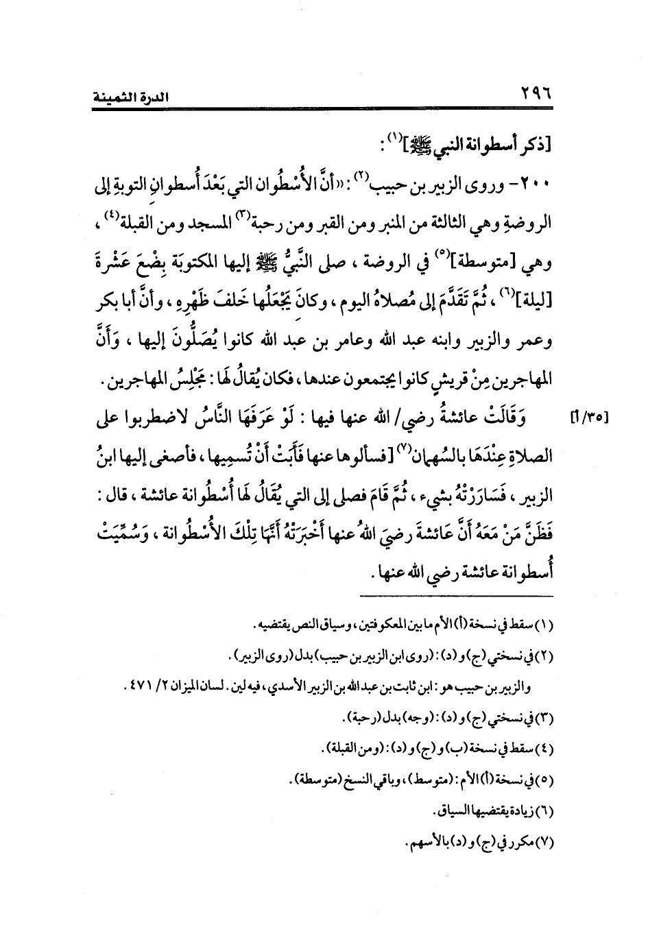 ٢٠٠ - وروى الزبير بن حبيب (¬٢): ((أنَّ الأُسْطُوان التي بَعْدَ أُسطوانِ التوبةِ إلى الروضةِ وهي الثالثة من المنبر ومن القبر ومن رحبة (¬٣) المسجد ومن القبلة (¬٤)، وهي [متوسطة] (¬٥) في الروضة، صلى النَّبيُّ صلى الله عليه وسلم إليها المكتوبَة بِضْعَ عَشْرةَ [ليلة] (¬٦)، ثُمَّ تَقَدَّمَ إلى مُصلاهُ اليوم، وكانَ يَجْعَلُها خَلفَ ظَهْرِهِ، وأنَّ أبا بكر وعمر والزبير وابنه عبد الله وعامر بن عبد الله كانوا يُصَلُّونَ إليها، وَأَنَّ المهاجرين مِنْ قريشٍ كانوا يجتمعون عندها، فكان يُقالُ لَها: مَجْلِسُ المهاجرين.