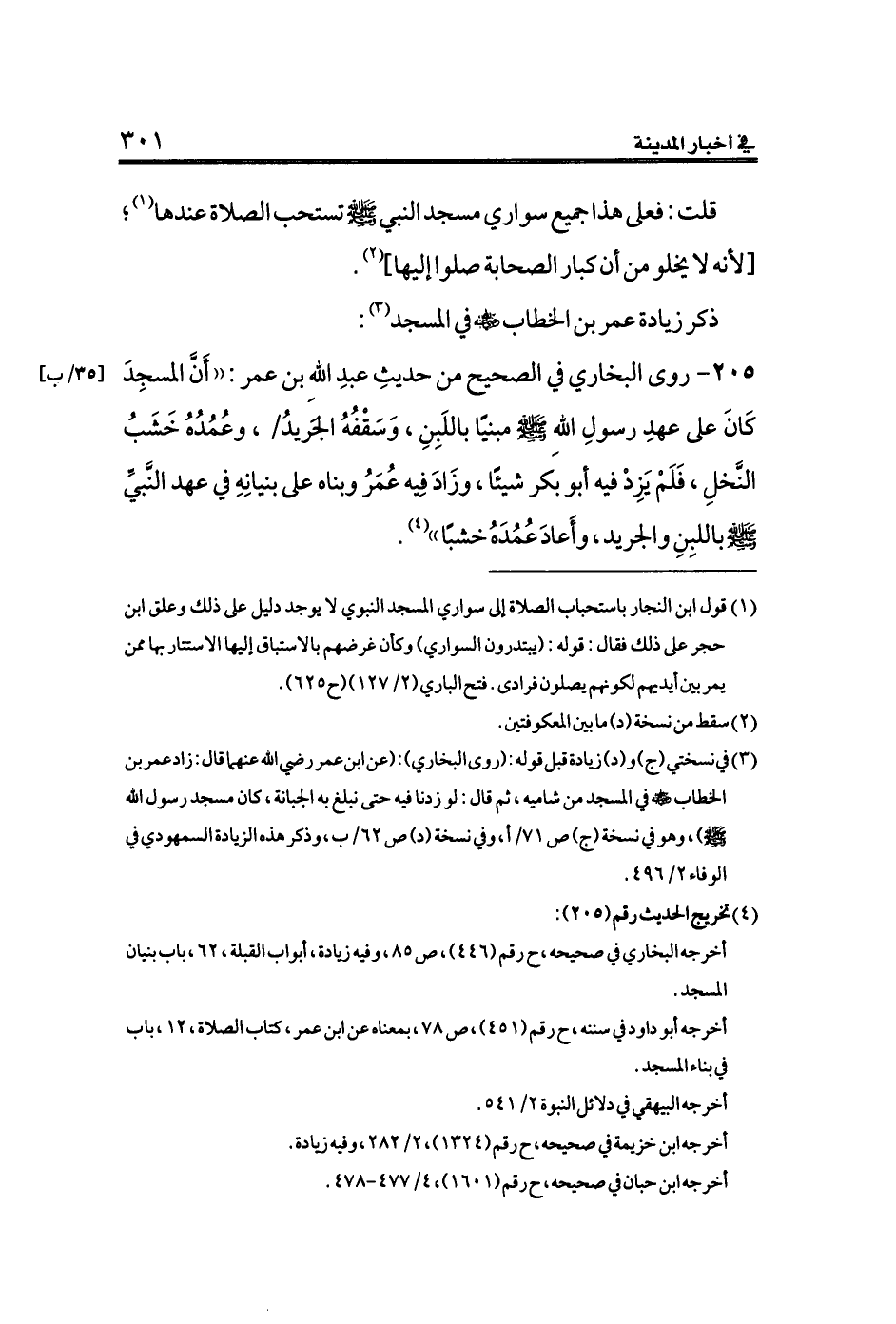 ٢٠٥ - روى البخاري في الصحيح من حديثِ عبدِ اللهِ بن عمر: ((أَنَّ المسجِدَ كَانَ على عهدِ رسولِ اللهِ صلى الله عليه وسلم مبنيًا باللَبِنِ، وَسَقْفُهُ الجَريدُ [٣٥/ب]، وعُمُدُهُ خَشَبُ النَّخلِ، فَلَمْ يَزِدْ فيه أبو بكر شيئًا، وزَادَ فِيه عُمَرُ وبناه على بنيانِهِ في عهد النَّبيِّ - صلى الله عليه وسلم - باللبِنِ والجريد، وأَعادَ عُمُدَهُ خشبًا)) (¬٤).