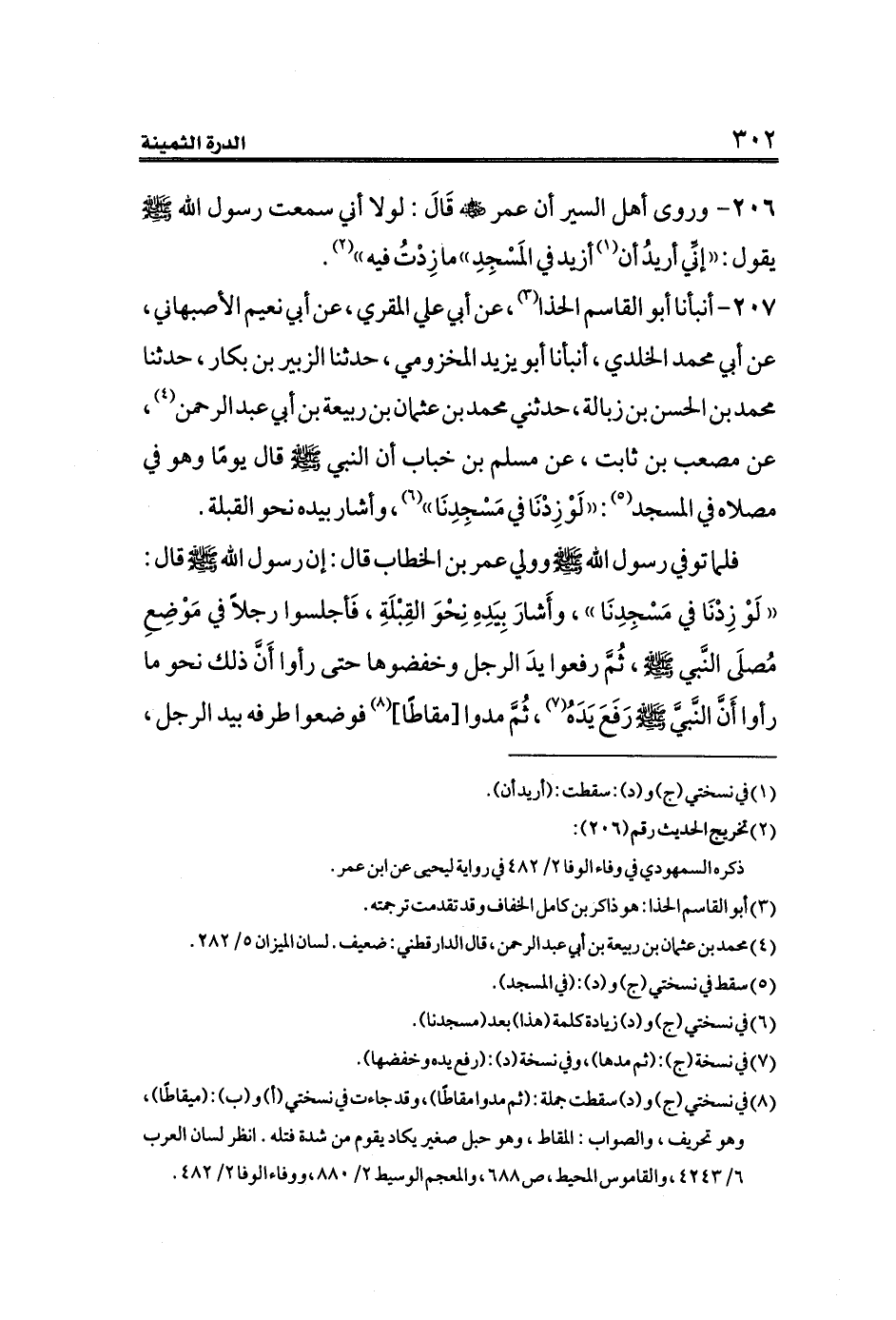 ٢٠٦ - وروى أهل السير أن عمر - رضي الله عنه - قَالَ: لولا أني سمعت رسول الله صلى الله عليه وسلم يقول: ((إنِّي أريدُ أن (¬١) أزيد في المَسْجِدِ)) ما زِدْتُ فيه)) (¬٢).