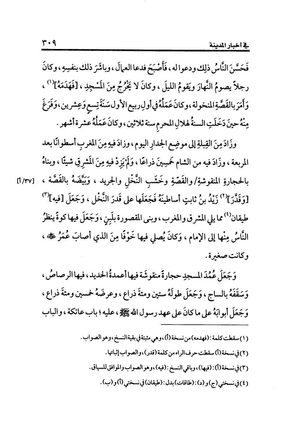وزَادَ مِنَ القِبلةِ إلى موضِع الجدارِ اليوم، وزادَ فيهِ مِنَ المغربِ أسطوانًا بعد المربعة، وزَادَ فيه من الشام خَمسِينَ ذراعًا، وَلَمْ يَزِدْ فيهِ مِنَ المَشرِقِ شيئًا، وبناهُ بالحجارةِ المنقوشةِ [٣٧/أ] والقَصّةِ وخَشَبِ النَّخْلِ والجريد، وَبَيَّضَهُ بالقَصَّة، [وَقَدَّرَ] (¬٢) زَيْدُ بنُ ثابتٍ أساطينَهُ فَجَعَلَها على قَدرَ النَّخْل، وَجَعَلَ [فيه] (¬٣) طيقان (¬٤) مما يلي المشرق والمغرب، وبنى المقصورة بلَبِنٍ، وَجَعَلَ فيها كوةً ينظرُ النَّاسُ مِنْها إلى الإمام، وَكانَ يُصلي فيها خَوْفًا مِنَ الذي أصابَ عُمَرُ - رضي الله عنه -، وكانت صغيرة.