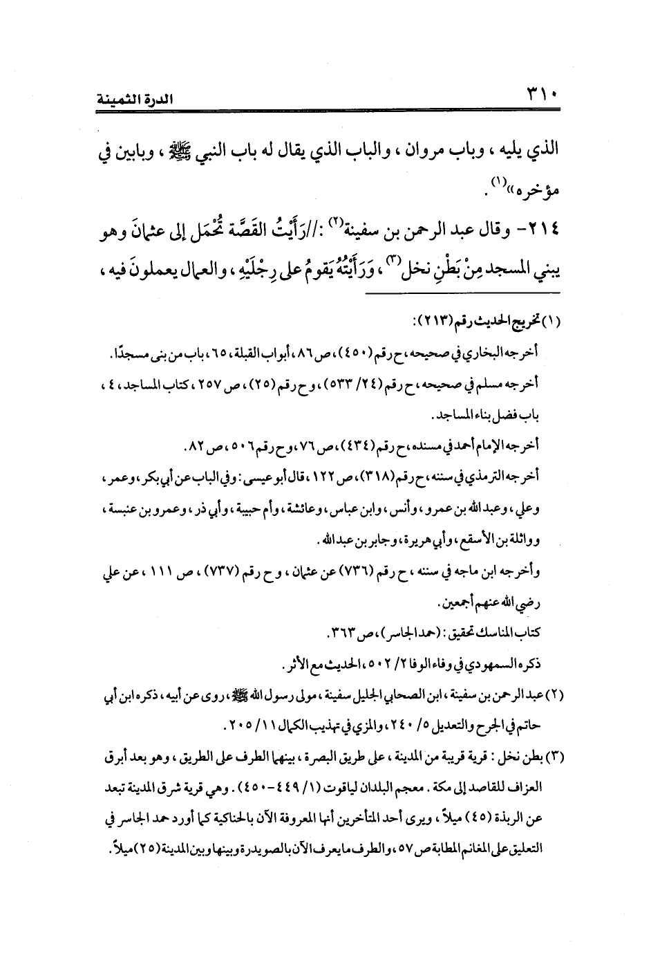 ٢١٤ - وقال عبد الرحمن بن سفينة (¬٢)://رَأَيْتُ القَصَّة تُحْمَل إلى عثمانَ وهو يبني المسجد مِنْ بَطْنِ نخل (¬٣)، وَرَأَيْتُهُ يَقومُ على رِجْلَيْهِ، والعمال يعملونَ فيه،