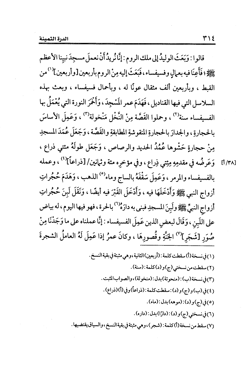 قالوا: وَبَعَثَ الوليدُ إلى ملك الروم: إنَّا نُريدُ أَنْ نعملَ مسجِدَ نبيِنا الأعظم - صلى الله عليه وسلم -؛ فَأَعِنَا فيه بعمالٍ وفسيفساء، فَبَعَثَ إليه مِنْ الروم بأربعين [وأربعين] (¬١) من القبط، وبأربعين ألف مثقال عونًا له، وبأحمال فسيفساء، وبعث بهذه السلاسل التي فيها القناديل، فَهَدَمَ عمر المَسْجِدَ، وَأَخْمَرَ النورة التي يُعْمَلُ بها الفسيفساء سنة (¬٢)، وحملوا القَصَّة مِنْ النَّخْل مَنْخولة (¬٣)، وَعَمِلَ الأساسَ بالحجارةِ، والجدارَ بالحجارةِ المنقوشةِ المطابقةِ والقَصَّة، وَجَعَلَ عُمَدَ المسجدِ مِنْ حجارةٍ حَشْوها عُمُدُ الحديد والرصاص، وَجَعَل طولَهُ مئتي ذراع، وَعَرضُه في مقدمِهِ مِئِتي ذِراع، وفي مؤخرِه مئة وثمانين [٣٨/أ] [ذراعاً] (¬٤)، وعمله بالفسيفساء والمرمر، وَعَمِلَ سَقْفَهُ بالساج وماء (¬٥) الذهب، وَهَدَمَ حُجُراتِ أزواج النبي الله صلى الله عليه وسلم وَأَدْخَلَهَا فيه، وَأَدْخَلَ القَبْرَ فيه أيضًا، وَنَقَلَ لَبِنَ حُجُراتِ أزواجِ النبيِّ صلى الله عليه وسلم ولَبِنَ المسجدِ فبنى به دارَهُ (¬٦) بالحرة، فهو فيها اليوم، له بياض على اللَبِنِ، وَقَالَ لبعضِ الذين عَمِلَ الفسيفساء: إنَّا عملناه على ما وَجَدْنَا مِنْ صُوَرِ [شَجَرِ] (¬٧) الجَنَّةِ وقُصورِهَا، وكانَ عمرُ إذا عَمِلَ لَهُ العاملُ الشجرةَ