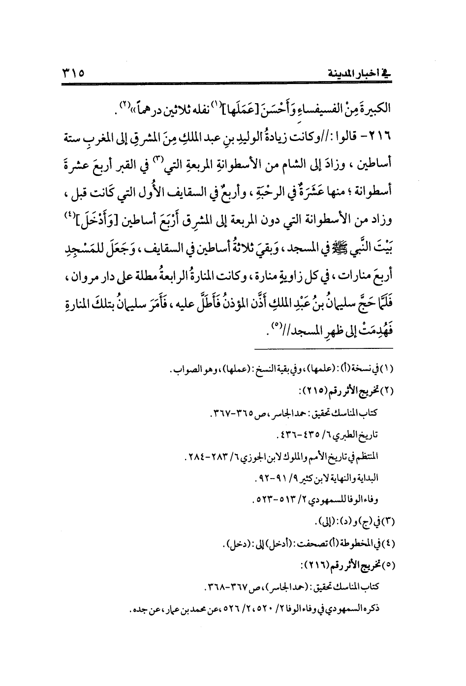 ٢١٦ - قالوا://وكانت زيادةُ الوليدِ بنِ عبد الملكِ مِنَ المشرقِ إلى المغربِ ستة أساطين، وزادَ إلى الشام من الأسطوانةِ المربعةِ التي (¬٣) في القبر أربعَ عشرةَ أسطوانة؛ منها عَشَرَةٌ في الرحْبَةِ، وأربعٌ في السقايف الأُول التي كَانت قبل، وزاد من الأسطوانة التي دون المربعة إلى المشرِق أَرْبَعَ أساطين [وَأَدْخَلَ] (¬٤) بَيْتَ النَّبي صلى الله عليه وسلم في المسجد، وَبقيَ ثلاثةُ أساطين في السقايف، وَجَعَلَ للمَسْجِدِ أربعَ منارات، في كل زاويةٍ منارة، وكانت المنارةُ الرابعةُ مطلة على دار مروان، فَلَمَّا حَجَّ سليمانُ بنُ عَبْدِ الملكِ أَذَّن المؤذنُ فَأَطَلَّ عليه، فَأَمَرَ سليمانُ بتلكَ المنارةِ فَهُدِمَتْ إلى ظهرِ المسجد// (¬٥).