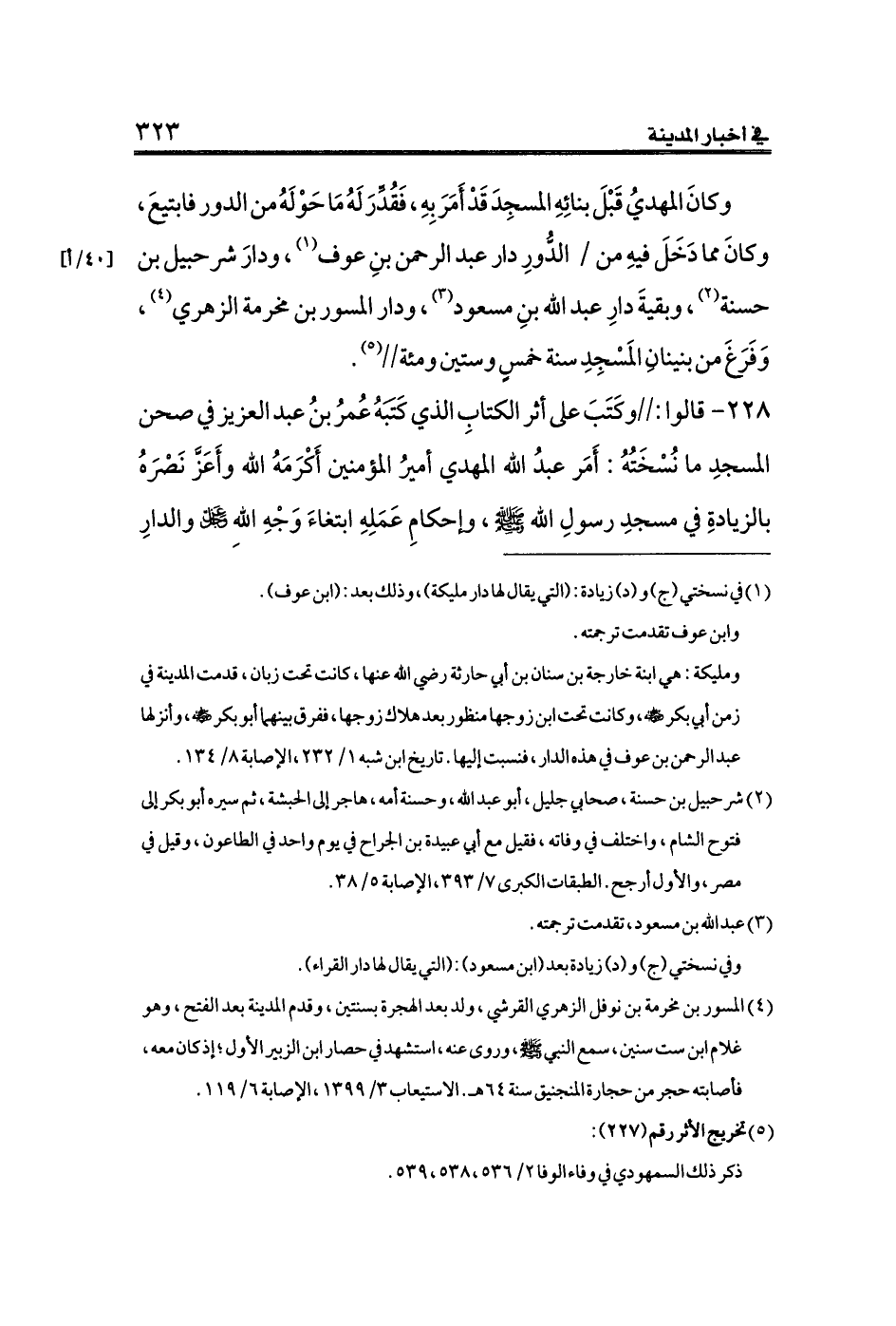 ٢٢٨ - قالوا://وكَتَبَ على أثر الكتابِ الذي كَتَبَهُ عُمرُ بنُ عبد العزيز في صحن المسجدِ ما نُسْخَتُهُ: أَمَر عبدُ الله المهدي أميرُ المؤمنين أَكْرَمَهُ الله وأَعَزَّ نَصْرَهُ بالزيادةِ في مسجدِ رسولِ الله - صلى الله عليه وسلم -، وإحكامِ عَمَلِهِ ابتغاءَ وَجْهِ اللهِ - عز وجل - والدارِ