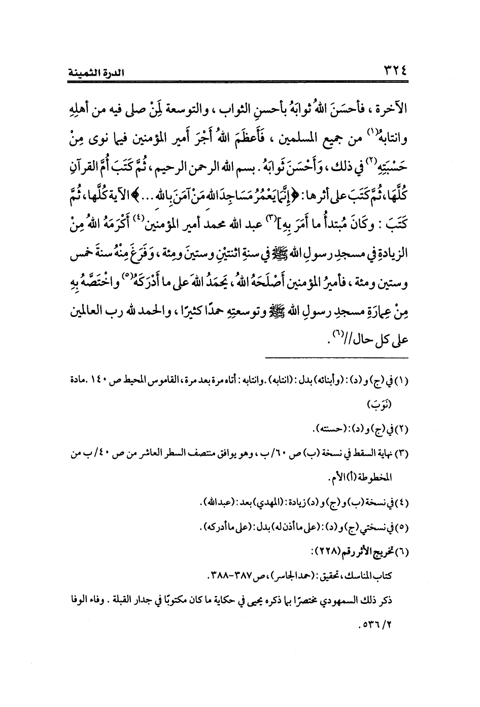 الآخرة، فأحسَنَ اللهُ ثوابَهُ بأحسنِ الثواب، والتوسعة لِمَنْ صلى فيه من أهلِهِ وانتابهُ (¬١) من جميع المسلمين، فَأَعظَمَ اللهُ أَجْرَ أَمير المؤمنين فيما نوى مِنْ حَسْبَتِهِ (¬٢) في ذلك، وَأَحْسَنَ ثَوابَهُ. بسم الله الرحمن الرحيم، ثُمَّ كَتَبَ أُمَّ القرآنِ كُلَّهَا، ثُمَّ كَتَبَ على أثرها: {إِنَّمَا يَعْمُرُ مَسَاجِدَ اللهِ مَنْ آمَنَ بِاللهِ ... } الآية كُلَّها، ثُمَّ كَتَبَ: وكَانَ مُبتدأُ ما أَمَرَ بِهِ] (¬٣) عبد الله محمد أمير المؤمنين (¬٤) أَكْرَمَهُ اللهُ مِنْ الزيادةِ في مسجدِ رسولِ الله - صلى الله عليه وسلم - في سنةِ اثنتيْنِ وستينَ ومِئة، وَفَرَغَ مِنْهُ سنةَ خمس وستين ومئة، فأميرُ المؤمنين أَصْلَحَهُ اللهُ، يَحمَدُ اللهَ على ما أَدْرَكَهُ (¬٥) واخْتَصَّهُ بِهِ مِنْ عِمارَةِ مسجدِ رسولِ الله - صلى الله عليه وسلم - وتوسعتِهِ حمدًا كثيرًا، والحمد لله رب العالمين على كل حال// (¬٦).
