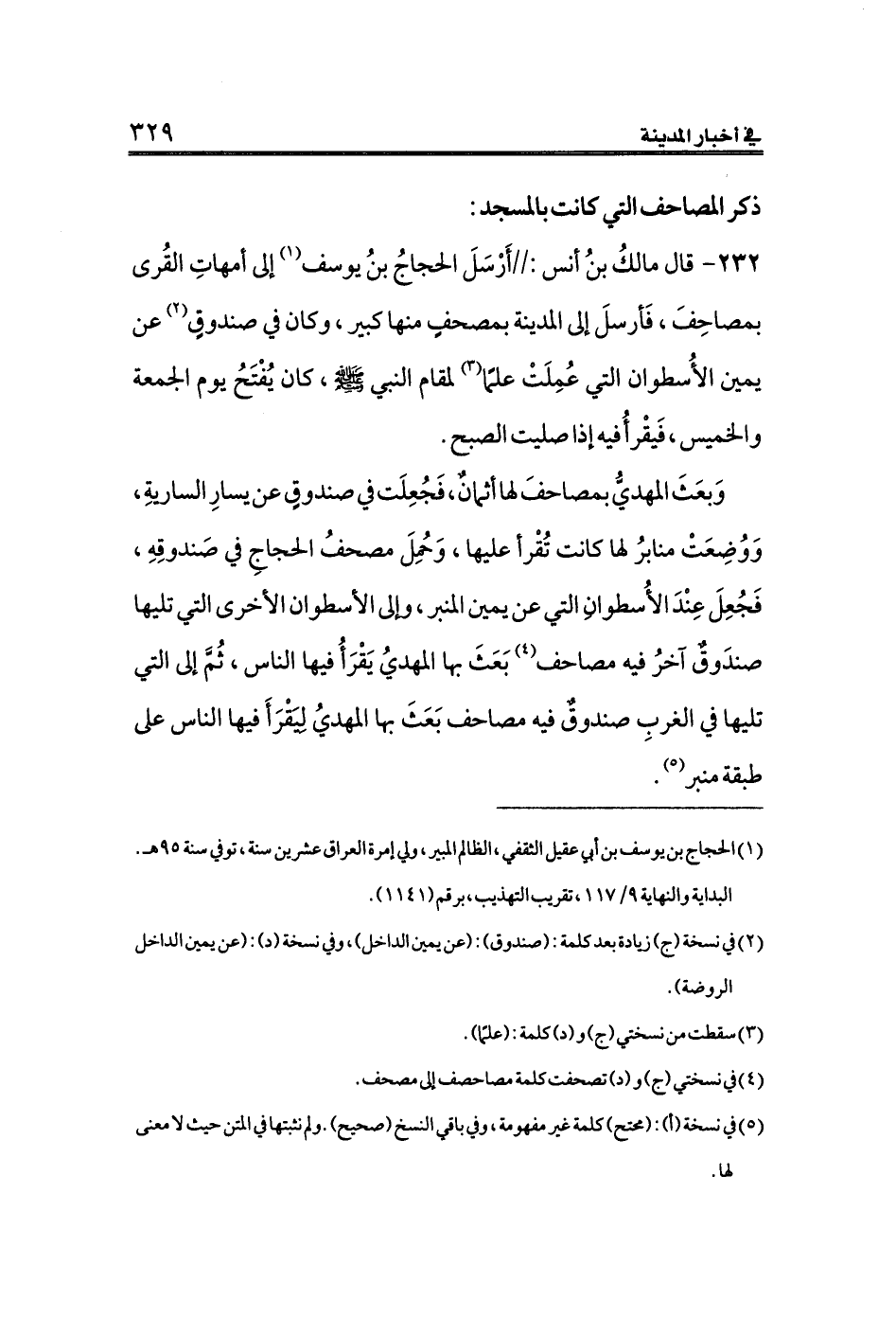 ٢٣٢ - قال مالكُ بنُ أنس://أَرْسَلَ الحجاجُ بنُ يوسف (¬١) إلى أمهاتِ القُرى بمصاحِفَ، فَأرسلَ إلى المدينة بمصحفٍ منها كبير، وكان في صندوقٍ (¬٢) عن يمين الأُسطوان التي عُمِلَتْ علمًا (¬٣) لمقام النبي صلى الله عليه وسلم، كان يُفْتَحُ يوم الجمعة والخميس، فَيقْرأُ فيه إذا صليت الصبح.