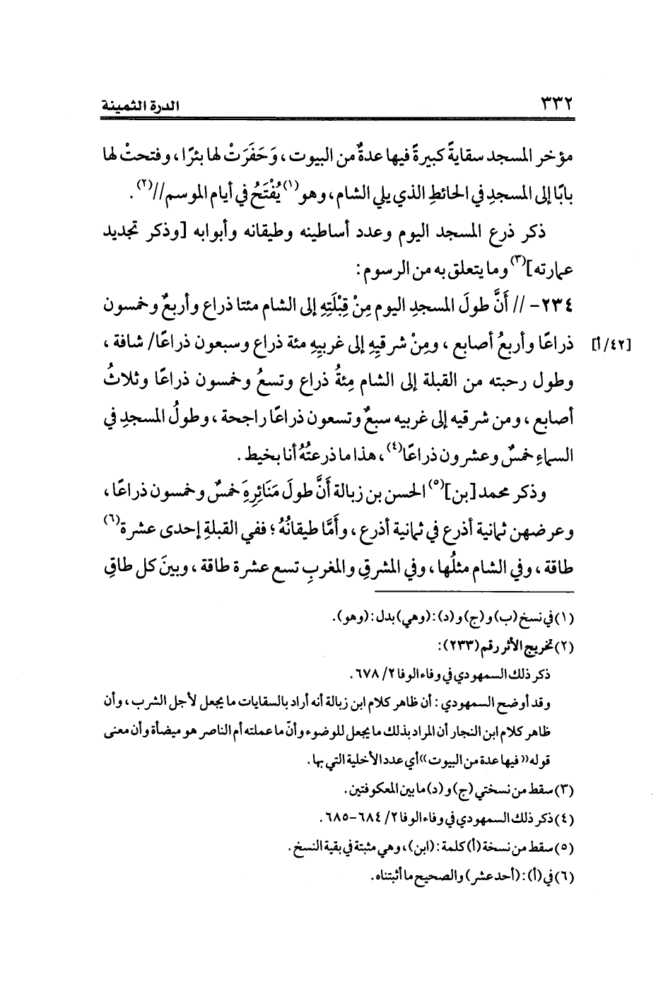 ٢٣٤ - // أَنَّ طولَ المسجدِ اليوم مِنْ قِبْلَتِهِ إلى الشام مئتا ذراع وأربعٌ وخمسون ذراعًا وأربعُ أصابع، ومِنْ شرقيِهِ إلى غربيِهِ مئة ذراع وسبعون ذراعًا [٤٢/أ] شافة، وطول رحبته من القبلة إلى الشام مِئةُ ذراع وتسعُ وخمسون ذراعًا وثلاثُ أصابع، ومن شرقيه إلى غربيه سبعٌ وتسعون ذراعًا راجحة، وطولُ المسجدِ في السماءِ خمسٌ وعشرون ذراعًا (¬٤)، هذا ما ذرعتُهُ أنا بخيط.