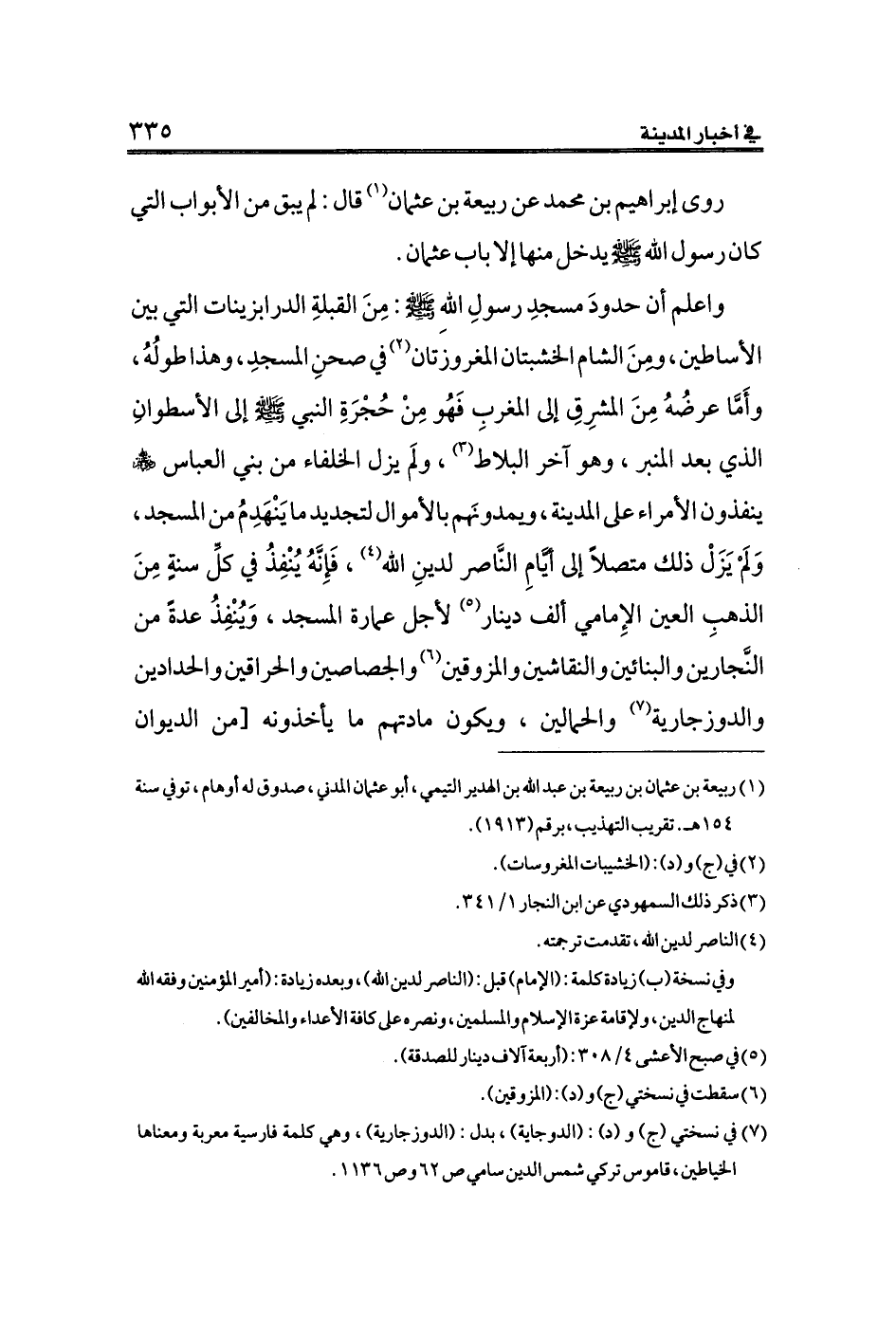 واعلم أن حدودَ مسجدِ رسولِ اللهِ - صلى الله عليه وسلم -: مِنَ القبلةِ الدرابزينات التي بين الأساطين، ومِنَ الشام الخشبتان المغروزتان (¬٢) في صحنِ المسجدِ، وهذا طولُهُ، وأَمَّا عرضُهُ مِنَ المشرِقِ إلى المغربِ فَهُو مِنْ حُجْرَةِ النبي الله صلى الله عليه وسلم إلى الأسطوانِ الذي بعد المنبر، وهو آخر البلاط (¬٣)، ولَم يزل الخلفاء من بني العباس - رضي الله عنهم - ينفذون الأمراء على المدينة، ويمدونَهم بالأموال لتجديد ما يَنْهَدِمُ من المسجد، وَلَمْ يَزَلْ ذلك متصلاً إلى أيَّامِ النَّاصر لدينِ الله (¬٤)، فَإِنَّهُ يُنْفِذُ في كلِّ سنةٍ مِنَ الذهبِ العين الإِمامي ألف دينار (¬٥) لأجل عمارة المسجد، وَيُنْفِذُ عدةً من النَّجارين والبنائين والنقاشين والمزوقين (¬٦) والجصاصين والحراقين والحدادين والدوزجارية (¬٧) والحمالين، ويكون مادتهم ما يأخذونه [من الديوان