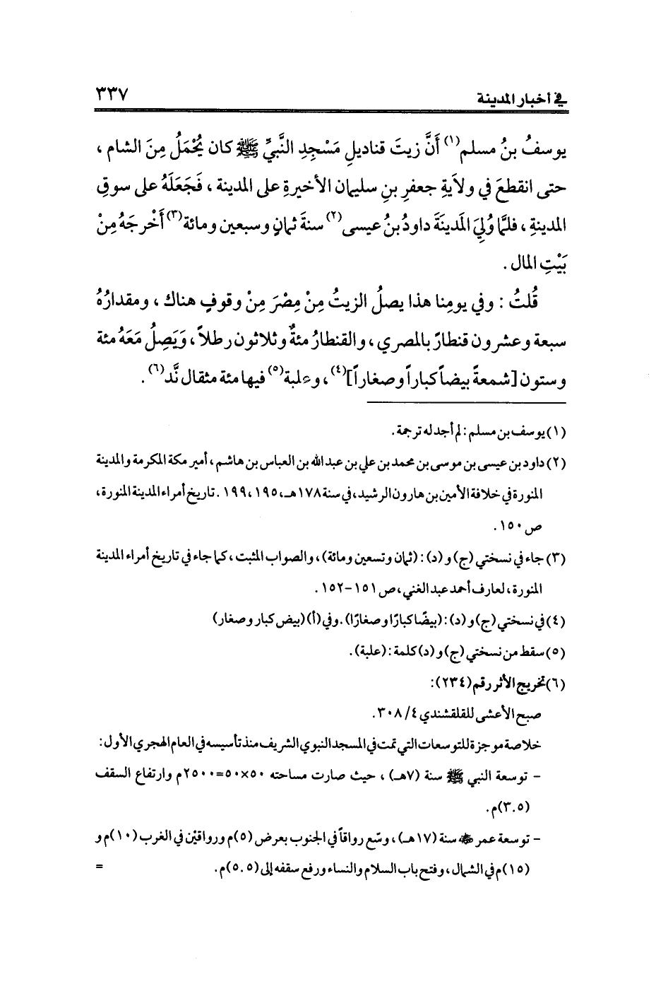 يوسفُ بنُ مسلم (¬١) أَنَّ زيتَ قناديلِ مَسْجِدِ النَّبيِّ صلى الله عليه وسلم كان يُحْمَلُ مِنَ الشام، حتى انقطعَ في ولَايةِ جعفرِ بنِ سليمان الأخيرةِ على المدينة، فَجَعَلَهُ على سوقِ المدينةِ، فلمَّا وُلِيَ المَدينَةَ داودُ بنُ عيسى (¬٢) سنةَ ثمانٍ وسبعين ومائة (¬٣) أَخْرجَهُ مِنْ بَيْتِ المال.