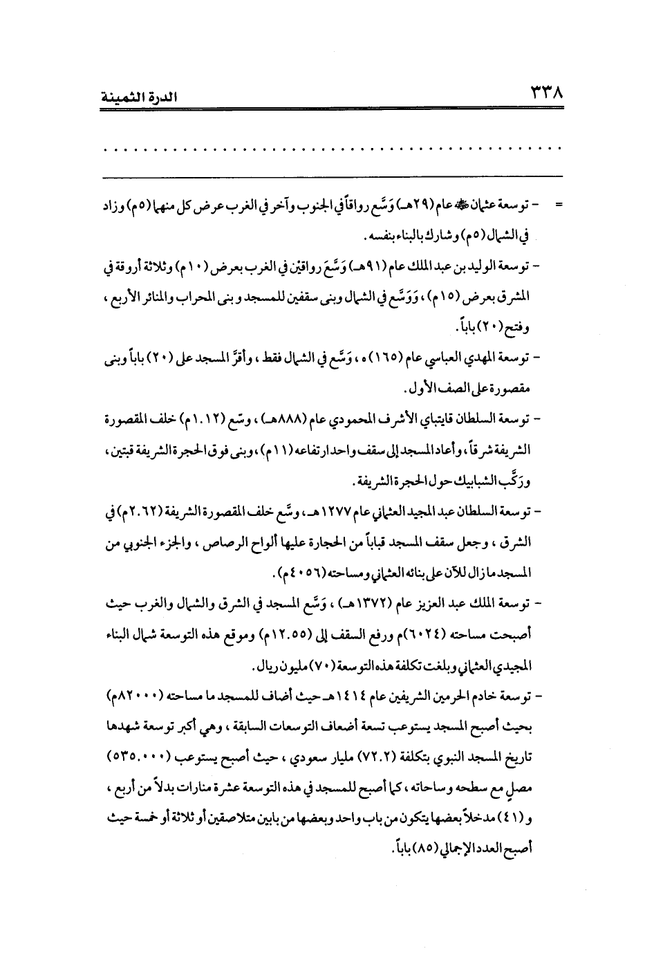= - توسعة عثمان - رضي الله عنه - عام (٢٩ هـ) وَسَّع رواقاً في الجنوب وآخر في الغرب عرض كل منهما (٥ م) وزاد في الشمال (٥ م) وشارك بالبناء بنفسه.
