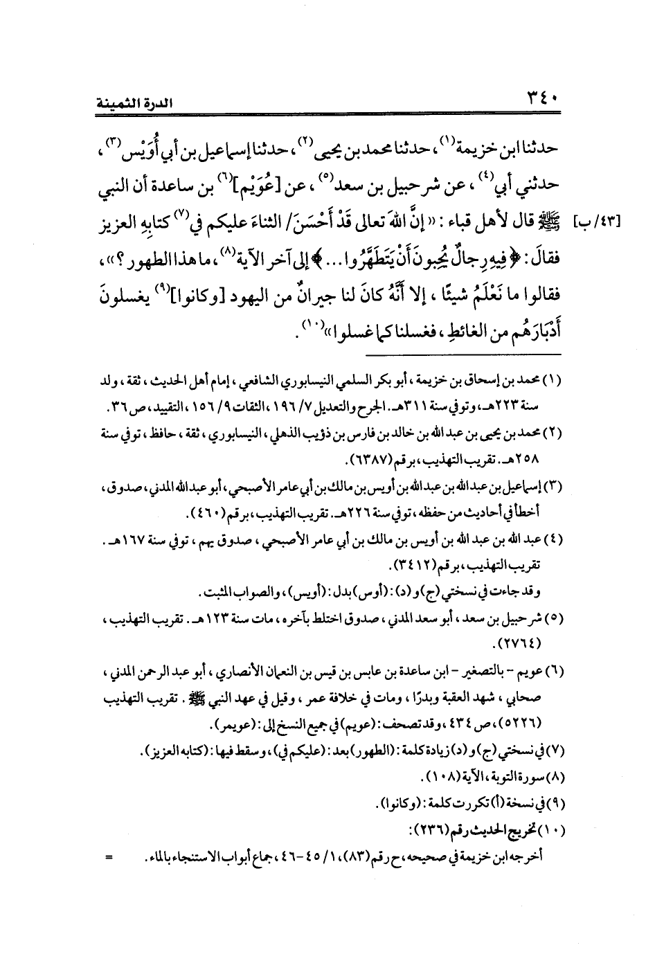 حدثنا ابن خزيمة (¬١)، حدثنا محمد بن يحيى (¬٢)، حدثنا إسماعيل بن أبي أُوَيْس (¬٣)، حدثني أبي (¬٤)، عن شرحبيل بن سعد (¬٥)، عن [عُوَيْم] (¬٦) بن ساعدة أن النبي الله صلى الله عليه وسلم قال لأهل قباء: ((إنَّ اللهَ تعالى قَدْ أَحْسَنَ [٤٣/ب] الثناءَ عليكم في (¬٧) كتابِهِ العزيز فقالَ: {فِيهِ رِجالٌ يُحِبونَ أَنْ يَتَطَهَّرُوا ... } إلى آخر الآية (¬٨)، ما هذا الطهور؟))، فقالوا ما نَعْلَمُ شيئًا، إلا أَنَّهُ كانَ لنا جيرانٌ من اليهود [وكانوا] (¬٩) يغسلونَ أَدْبَارَهُم من الغائطِ، فغسلنا كما غسلوا)) (¬١٠).