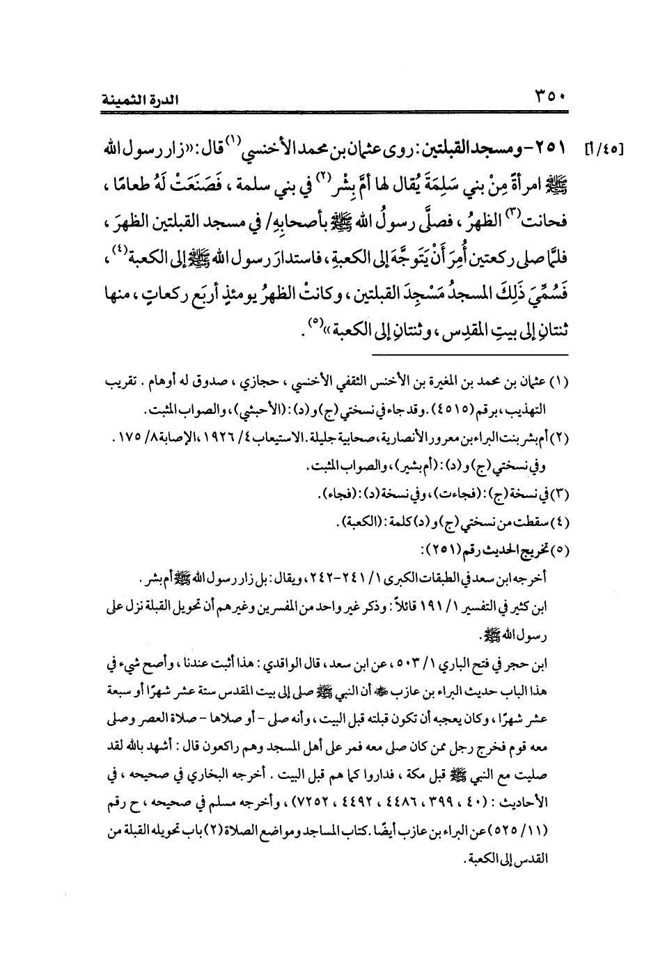 ٢٥١ - ومسجد القبلتين: روى عثمان بن محمد الأخنسي (¬١) قال: ((زار رسول الله صلى الله عليه وسلم امرأةً مِنْ بني سَلِمَةَ يُقال لها أمَّ بِشْر (¬٢) في بني سلمة، فَصَنَعَتْ لَهُ طعامًا، فحانت (¬٣) الظهرُ، فصلَّى رسولُ الله صلى الله عليه وسلم بأصحابِهِ [٤٥/أ] في مسجد القبلتين الظهرَ، فلمَّا صلى ركعتين أُمِرَ أَنْ يَتَوجَّهَ إلى الكعبةِ، فاستدارَ رسول الله صلى الله عليه وسلم إلى الكعبة (¬٤)، فَسُمِّيَ ذَلِكَ المسجدُ مَسْجِدَ القبلتين، وكانتْ الظهرُ يومئذٍ أربَع ركعاتٍ، منها ثنتانِ إلى بيتِ المقدِس، وثنتانِ إلى الكعبة)) (¬٥).