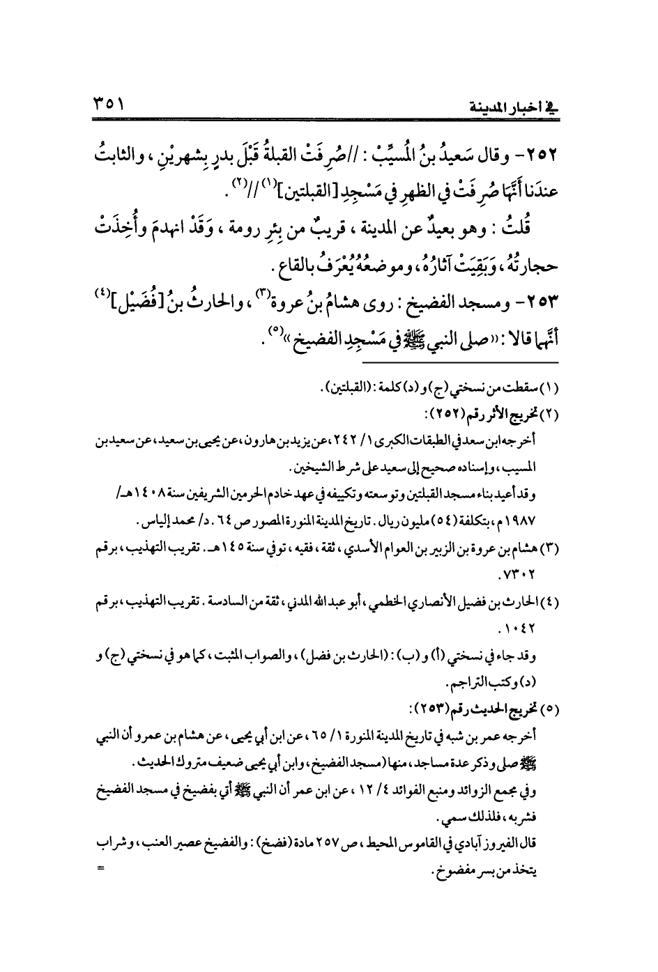 ٢٥٣ - ومسجد الفضيخ: روى هشامُ بنُ عروة (¬٣)، والحارثُ بنُ [فُضَيْل] (¬٤) أنَّهما قالا: ((صلى النبي الله صلى الله عليه وسلم في مَسْجِدِ الفضيخ)) (¬٥).