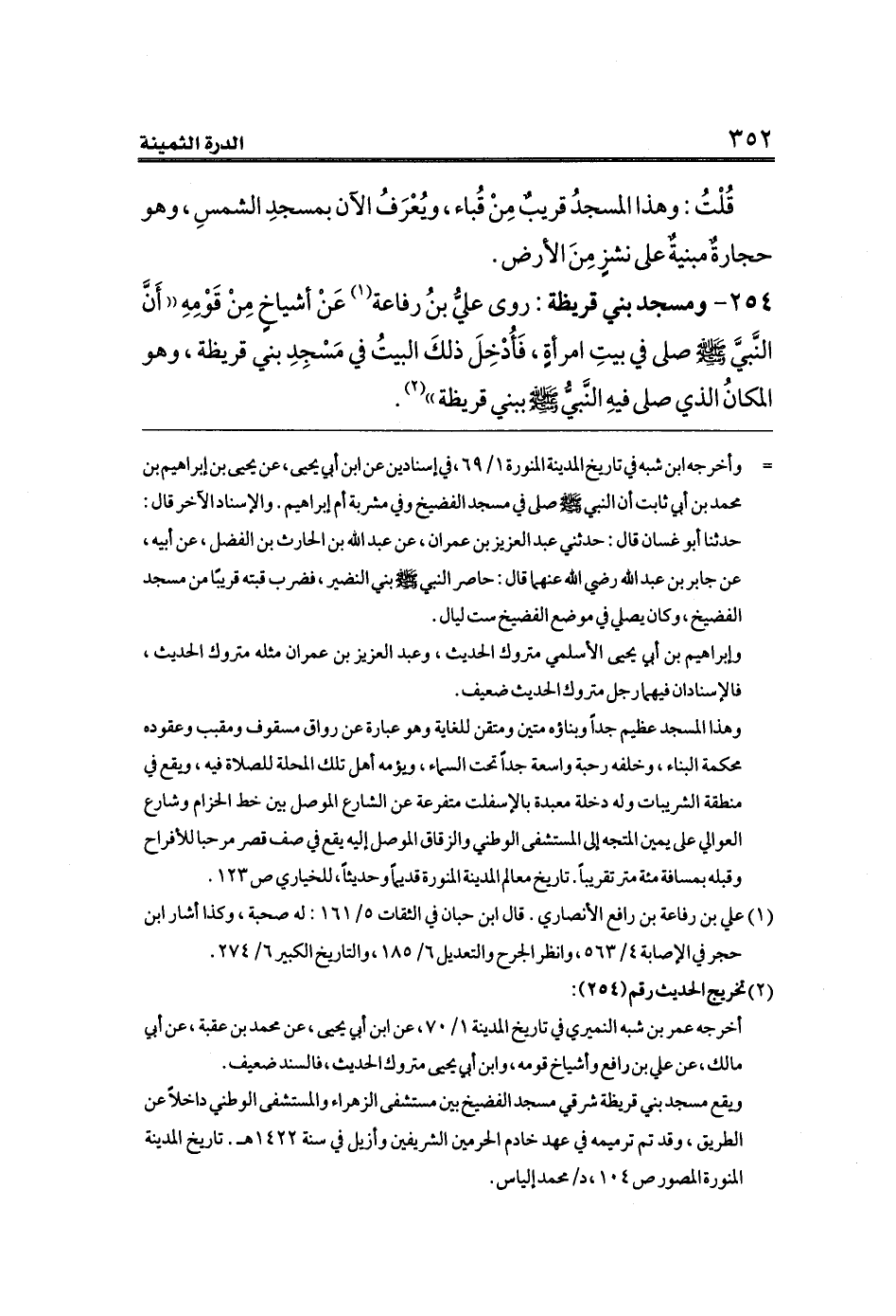 ٢٥٤ - ومسجد بني قريظة: روى عليُّ بنُ رفاعة (¬١) عَنْ أشياخٍ مِنْ قَوْمِهِ ((أَنَّ النَّبيَّ صلى الله عليه وسلم صلى في بيتِ امرأةٍ، فَأُدْخِلَ ذلكَ البيتُ في مَسْجِدِ بني قريظة، وهو المكانُ الذي صلى فيهِ النَّبيُّ صلى الله عليه وسلم ببني قريظة)) (¬٢).