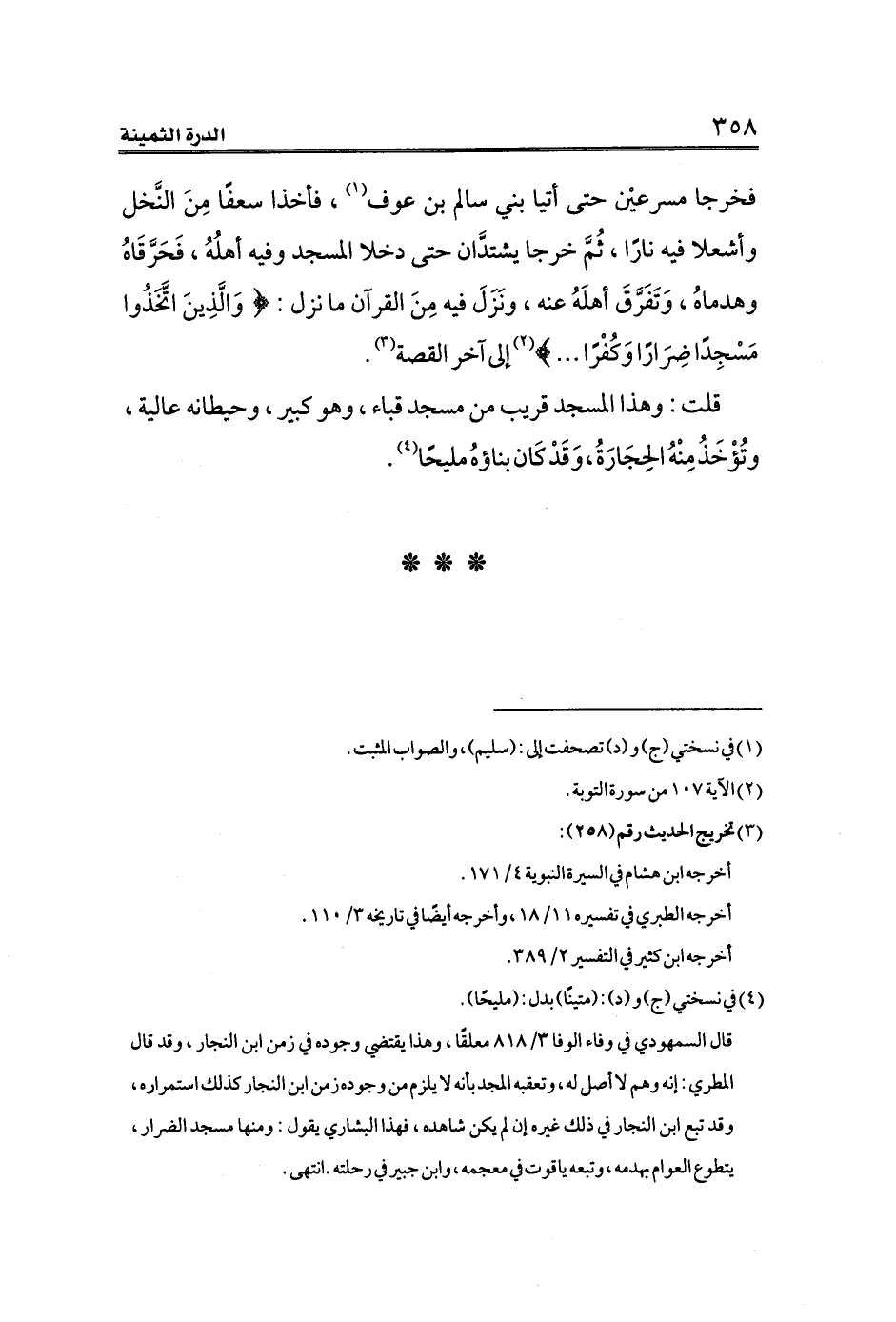 قال السمهودي في وفاء الوفا ٣/ ٨١٨ معلقًا، وهذا يقتضي وجوده في زمن ابن النجار، وقد قال المطري: إنه وهم لا أصل له، وتعقبه المجد بأنه لا يلزم من وجوده زمن ابن النجار كذلك استمراره، وقد تبع ابن النجار في ذلك غيره إن لم يكن شاهده، فهذا البشاري يقول: ومنها مسجد الضرار، يتطوع العوام بهدمه، وتبعه ياقوت في معجمه، وابن جبير في رحلته. انتهى.