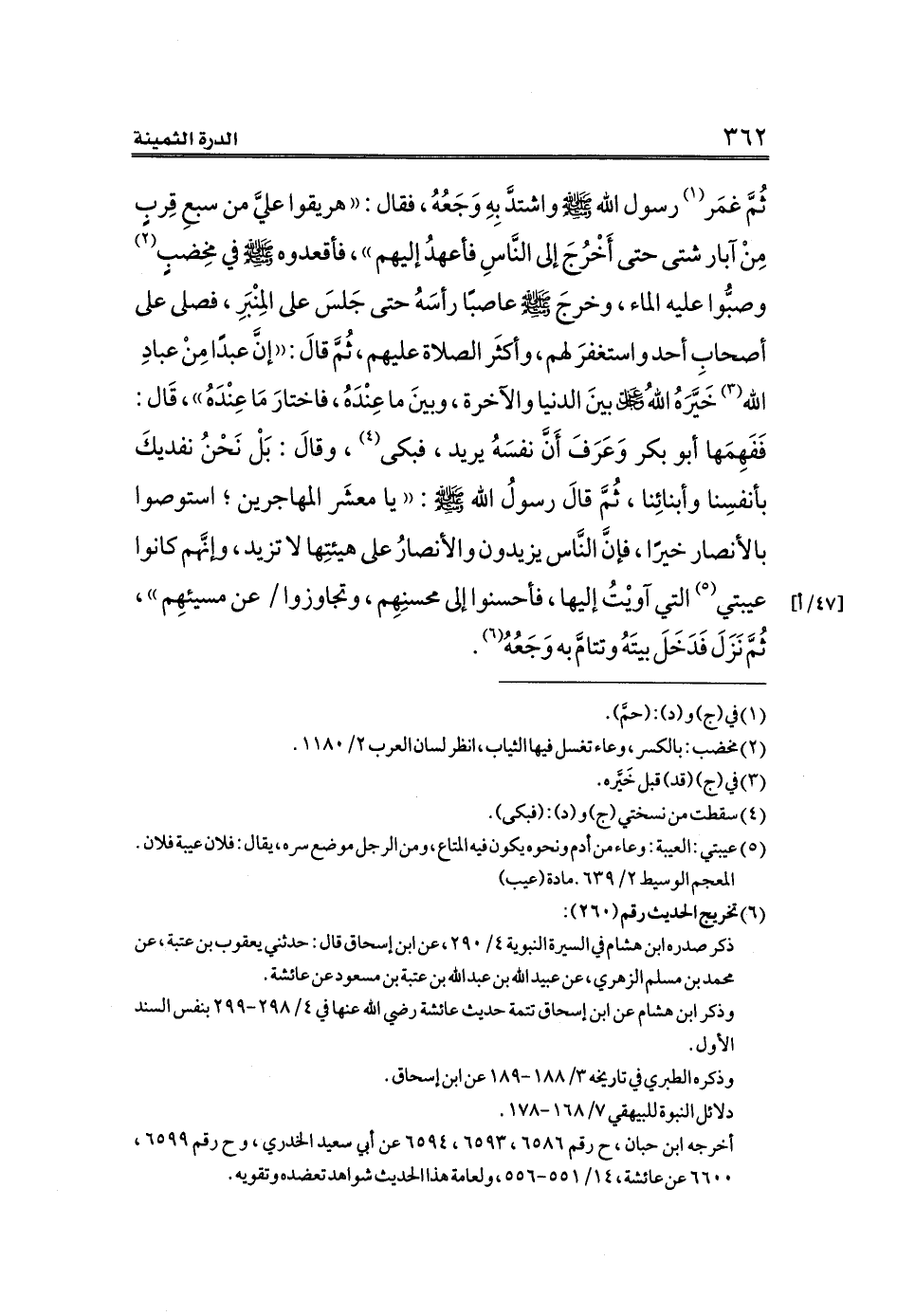 ثُمَّ غمَر (¬١) رسول الله صلى الله عليه وسلم واشتدَّ بِهِ وَجَعُهُ، فقال: ((هريقوا عليَّ من سبعِ قِربٍ مِنْ آبار شتى حتى أَخْرُجَ إلى النَّاسِ فأعهدُ إليهم))، فأقعدوه - صلى الله عليه وسلم - في مِخضبٍ (¬٢) وصبُّوا عليه الماء، وخرجَ صلى الله عليه وسلم عاصبًا رأسَهُ حتى جَلسَ على المِنْبَرِ، فصلى على أصحابِ أحد واستغفرَ لهم، وأكثَر الصلاة عليهم، ثُمَّ قالَ: ((إنَّ عبدًا مِنْ عبادِ الله (¬٣) خَيَّرَهُ اللهُ - عز وجل - بينَ الدنيا والآخرة، وبينَ ما عِنْدَهُ، فاختارَ مَا عِنْدَهُ))، قَال: فَفَهِمَها أبو بكر وَعَرَفَ أَنَّ نفسَهُ يريد، فبكى (¬٤)، وقالَ: بَلْ نَحْنُ نفديكَ بأنفسِنا وأبنائِنا، ثُمَّ قالَ رسولُ الله صلى الله عليه وسلم: ((يا معشَر المهاجرين؛ استوصوا بالأنصار خيرًا، فإنَّ النَّاس يزيدون والأنصارُ على هيئتِها لا تزيد، وإنَّهم كانوا عيبتي (¬٥) التي آويْتُ إليها، فأحسنوا إلى محسنِهِم، وتجاوزوا [٤٧/أ] عن مسيئهِم))، ثُمَّ نَزَلَ فَدَخَلَ بيتَهُ وتتامَّ به وَجَعُهُ (¬٦).
