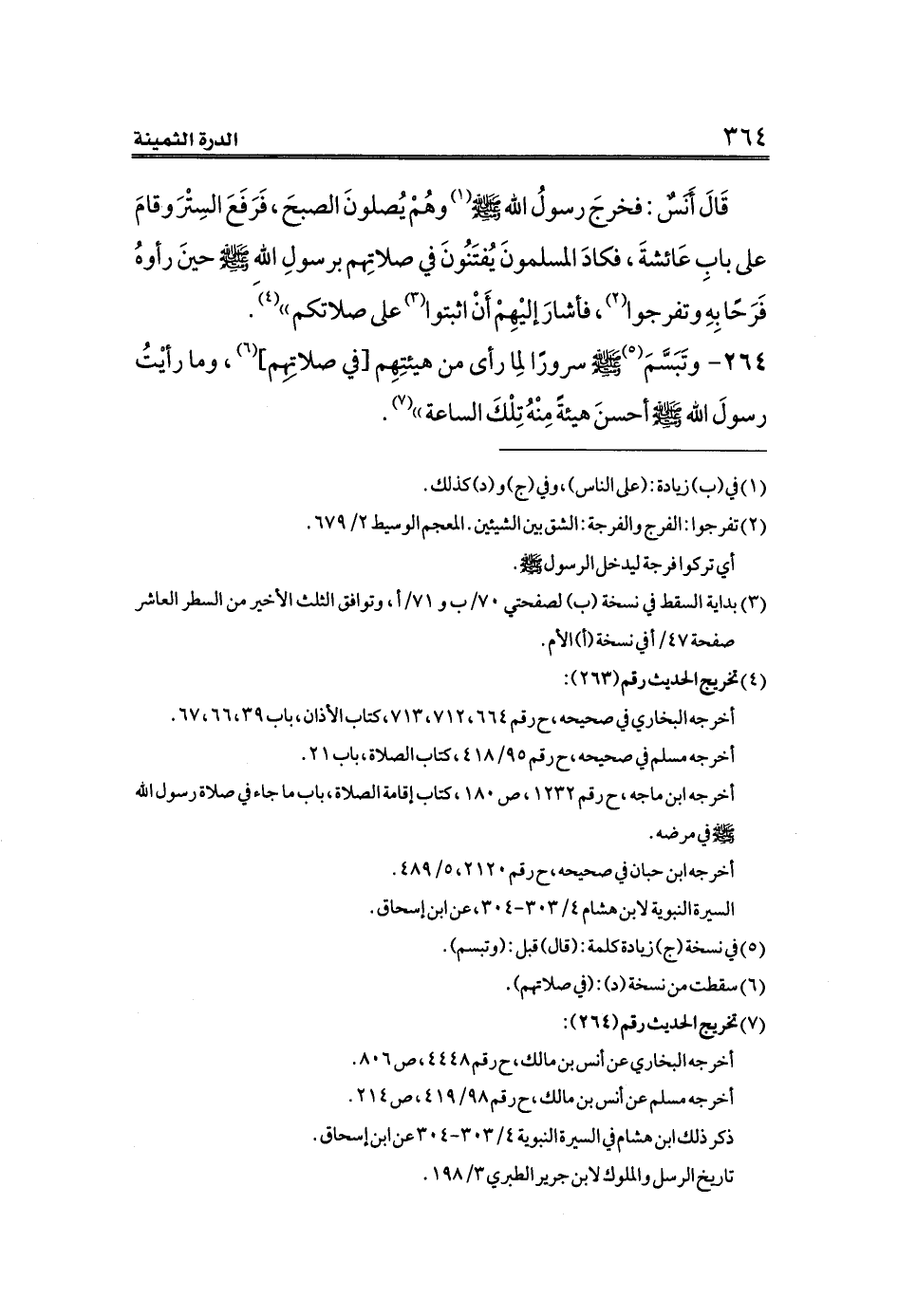 ٢٦٤ - وتَبَسَّمَ (¬٥) صلى الله عليه وسلم سرورًا لِما رأى من هيئتِهِم [في صلاتِهِم] (¬٦)، وما رأيْتُ رسولَ الله صلى الله عليه وسلم أحسنَ هيئةً مِنْهُ تِلْكَ الساعة)) (¬٧).