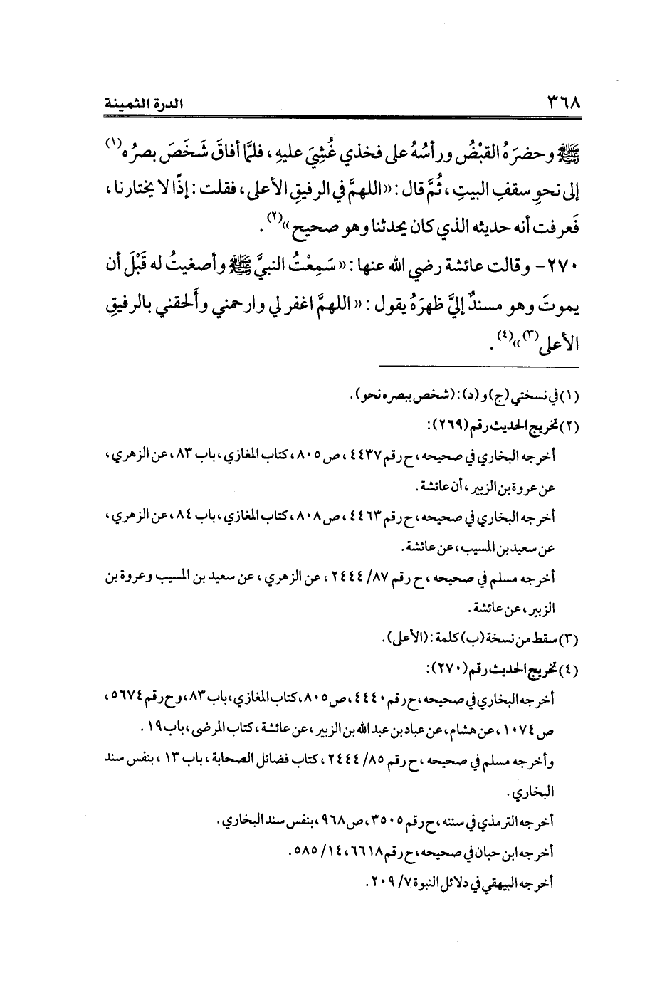 ٢٧٠ - وقالت عائشة رضي الله عنها: ((سَمِعْتُ النبيَّ - صلى الله عليه وسلم - وأصغيتُ له قَبْلَ أن يموتَ وهو مسندٌ إليَّ ظهرَهُ يقول: ((اللهمَّ اغفر لي وارحمني وأَلحقني بالرفيقِ الأعلى (¬٣))) (¬٤).