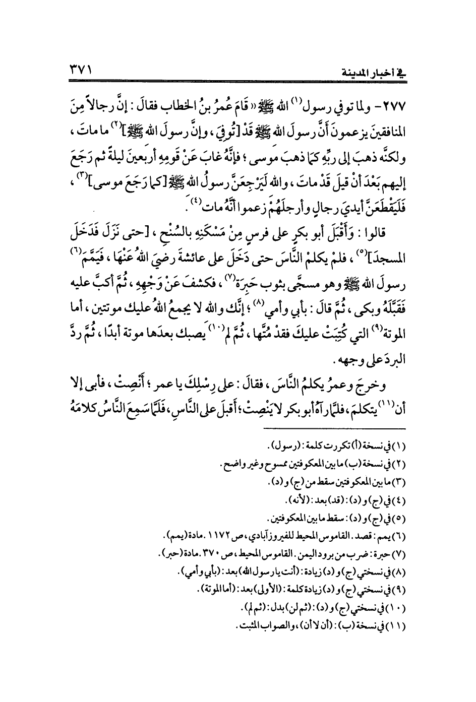 ٢٧٧ - ولما توفي رسول (¬١) الله - صلى الله عليه وسلم - ((قَامَ عُمرُ بنُ الخطاب فقالَ: إنَّ رجالاً مِنَ المنافقينَ يزعمونَ أَنَّ رسولَ اللهِ صلى الله عليه وسلم قَدْ [تُوفِيَ، وإنَّ رسولَ اللهِ صلى الله عليه وسلم] (¬٢) ما ماتَ، ولكنَّه ذهبَ إلى ربِّهِ كمَا ذهبَ موسى؛ فإنَّهُ غابَ عَنْ قَومِهِ أربعينَ ليلةً ثم رَجَعَ إليهم بَعْدَ أنْ قيلَ قَدْ ماتَ، واللهِ لَيَرْجِعَنَّ رسولُ اللهِ} [كما رَجَعَ موسى] (¬٣)، فَلَيَقْطَعَنَّ أيديَ رجالٍ وأرجلَهُمْ زعموا أنَّهُ مات (¬٤).