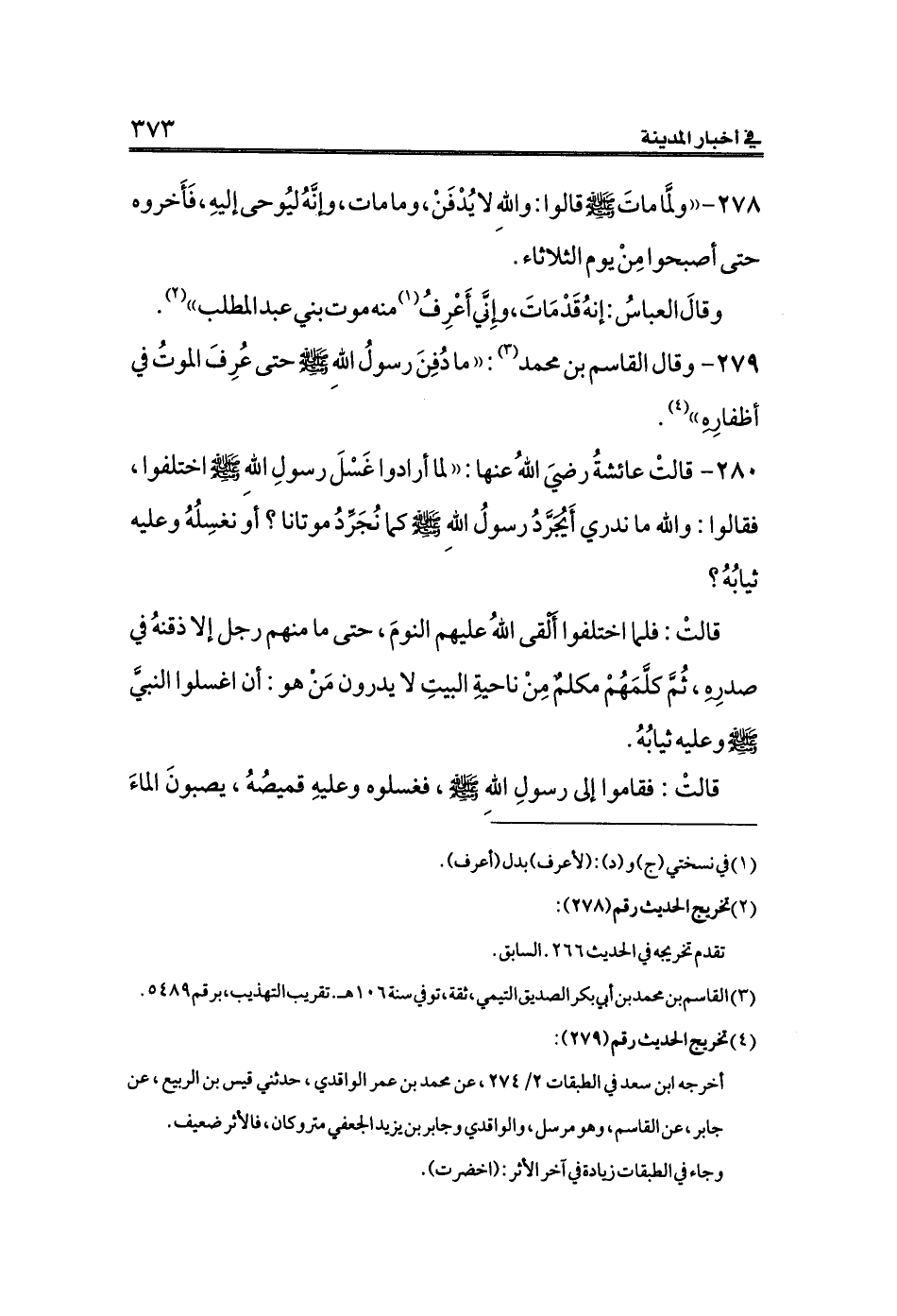 ٢٧٩ - وقال القاسم بن محمد (¬٣): ((ما دُفِنَ رسولُ اللهِ - صلى الله عليه وسلم -حتى عُرِفَ الموتُ في أظفارِهِ)) (¬٤).
