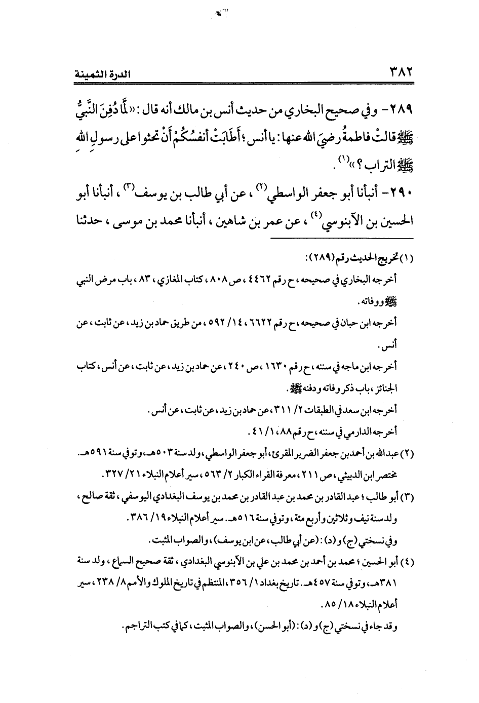 ٢٩٠ - أنبأنا أبو جعفر الواسطي (¬٢)، عن أبي طالب بن يوسف (¬٣)، أنبأنا أبو الحسين بن الآبنوسي (¬٤)، عن عمر بن شاهين، أنبأنا محمد بن موسى، حدثنا