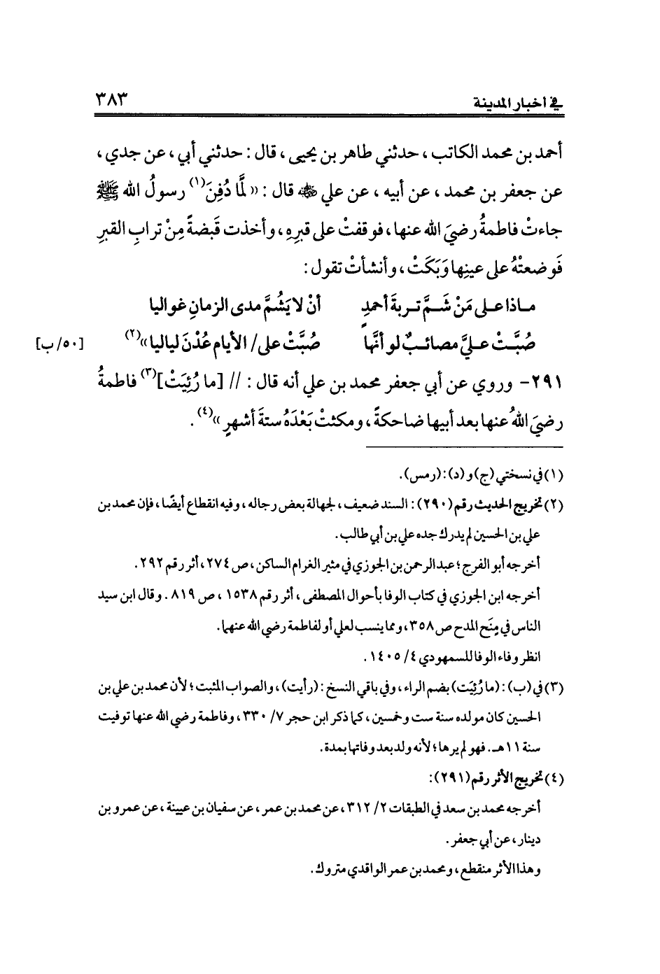 أحمد بن محمد الكاتب، حدثني طاهر بن يحيى، قال: حدثني أبي، عن جدي، عن جعفر بن محمد، عن أبيه، عن علي - رضي الله عنه - قال: ((لَمَّا دُفِنَ (¬١) رسولُ الله صلى الله عليه وسلم جاءتْ فاطمةُ رضيَ الله عنها، فوقفتْ على قبرِهِ، وأخذت قَبضةً مِنْ ترابِ القبرِ فَوضعتْهُ على عينِها وَبَكَتْ، وأنشأتْ تقول: