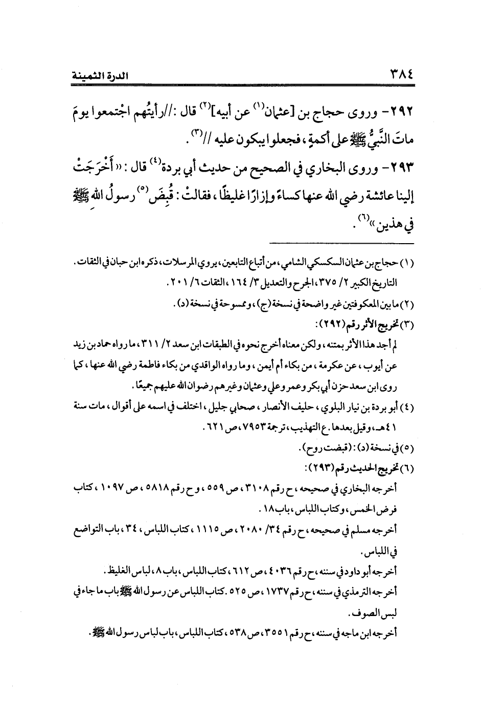 ٢٩٣ - وروى البخاري في الصحيح من حديث أبي بردة (¬٤) قال: ((أَخْرَجَتْ إلينا عائشة رضي الله عنها كساءً وإزارًا غليظًا، فقالتْ: قُبِضَ (¬٥) رسولُ اللهِ - صلى الله عليه وسلم -في هذين)) (¬٦).