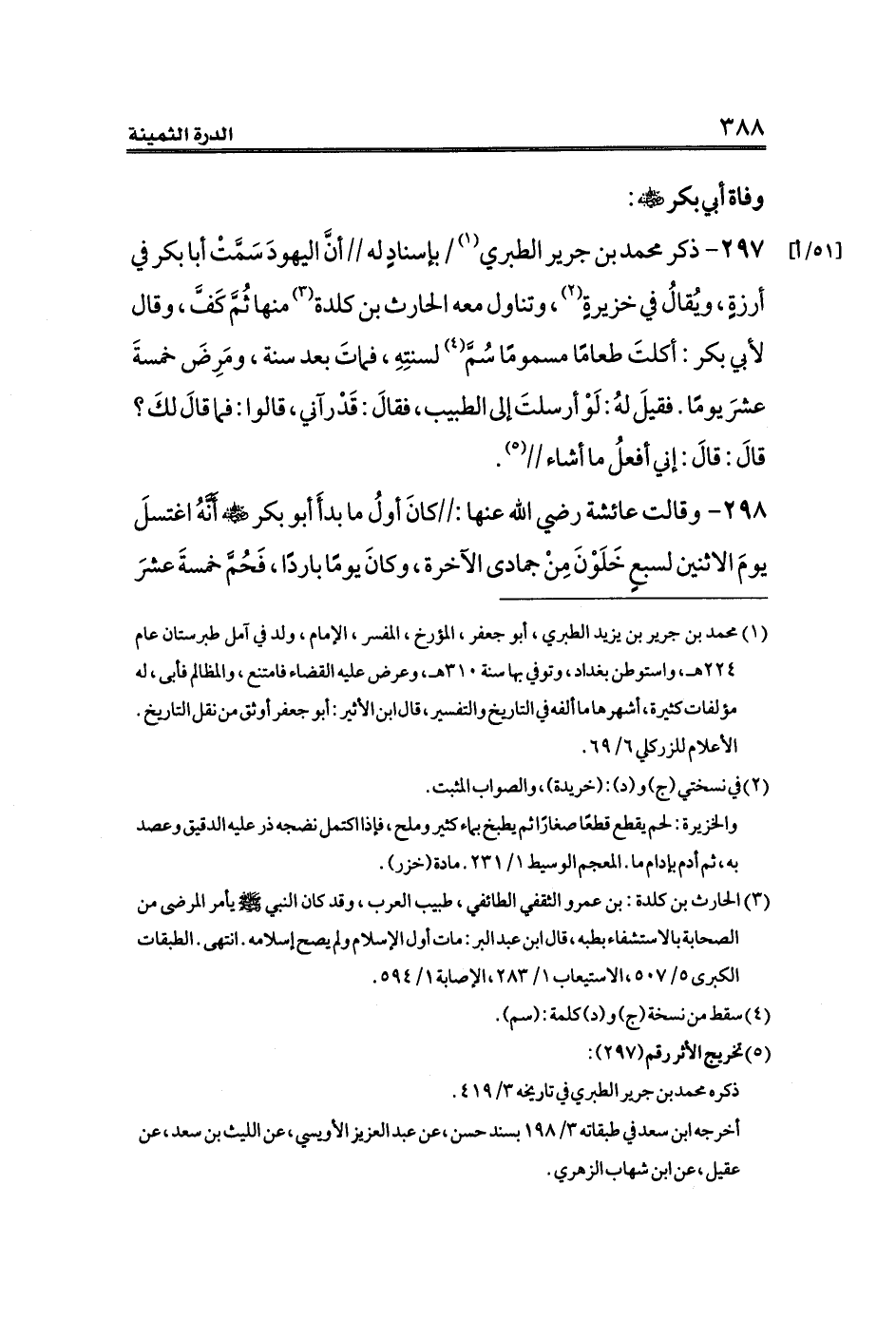 ٢٩٧ - ذكر محمد بن جرير الطبري (¬١) [٥١/أ] بإسنادٍ له // أنَّ اليهودَ سَمَّتْ أبا بكر في أرزةٍ، ويُقالُ في خزيرةٍ (¬٢)، وتناول معه الحارث بن كلدة (¬٣) منها ثُمَّ كَفَّ، وقال لأبي بكر: أكلتَ طعامًا مسمومًا سُمَّ (¬٤) لسنتِهِ، فماتَ بعد سنة، ومَرِضَ خمسةَ عشرَ يومًا. فقيلَ لهُ: لَوْ أرسلتَ إلى الطبيب، فقالَ: قَدْ رآني، قالوا: فما قالَ لكَ؟ قالَ: قالَ: إني أفعلُ ما أشاء // (¬٥).