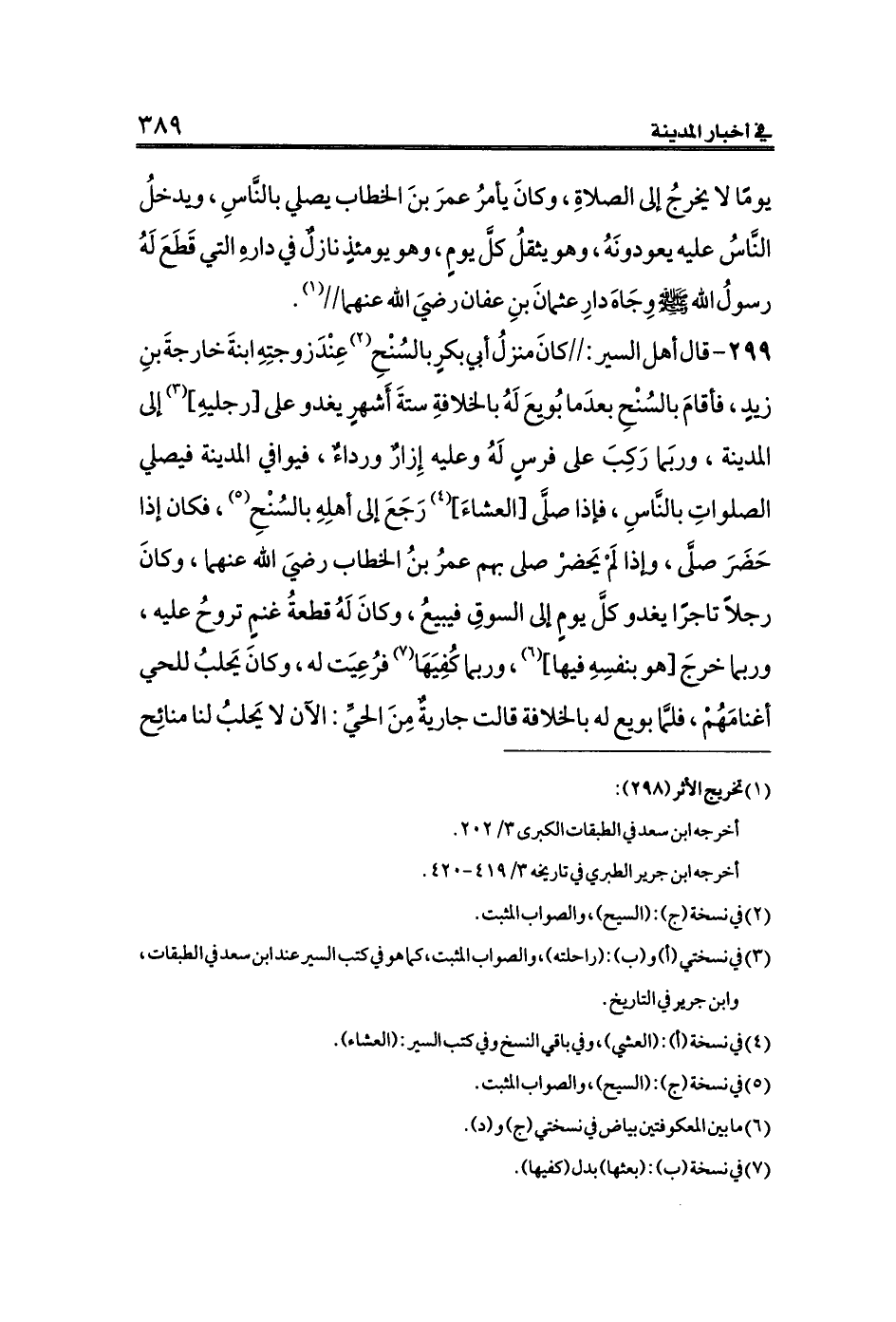 ٢٩٩ - قال أهل السير://كانَ منزلُ أبي بكرٍ بالسُنْحِ (¬٢) عِنْدَ زوجتِهِ ابنةَ خارجةَ بنِ زيدٍ، فأقامَ بالسُنْحِ بعدَما بُويِعَ لَهُ بالخلافةِ ستةَ أَشهرٍ يغدو على [رجليهِ] (¬٣) إلى المدينة، وربَما رَكِبَ على فرسٍ لَهُ وعليه إِزارٌ ورداءٌ، فيوافي المدينة فيصلي الصلواتِ بالنَّاسِ، فإذا صلَّى [العشاءَ] (¬٤) رَجَعَ إلى أهلِهِ بالسُنْحِ (¬٥)، فكان إذا حَضَرَ صلَّى، وإذا لَمْ يَحضرْ صلى بهم عمرُ بنُ الخطاب رضيَ الله عنهما، وكانَ رجلاً تاجرًا يغدو كلَّ يومٍ إلى السوقِ فيبيعُ، وكانَ لَهُ قطعةُ غنمٍ تروحُ عليه، وربما خرجَ [هو بنفسِهِ فيها] (¬٦)، وربما كُفِيَهَا (¬٧) فرُعِيَت له، وكانَ يَحلبُ للحي أغنامَهُمْ، فلمَّا بويع له بالخلافة قالت جاريةٌ مِنَ الحيِّ: الآن لا يَحلبُ لنا منائِح