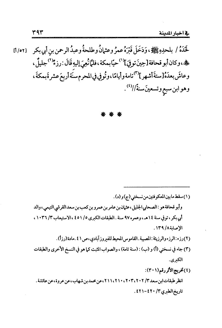 لَحْدَهُ [٥٢/أ] بلحدِهِ - صلى الله عليه وسلم -، وَدَخَلَ قَبْرَهُ عمرُ وعثمانُ وطلحةُ وعبدُ الرحمن بنِ أبي بكر - رضي الله عنهم -، وكان أبو قحافة [حِينَ توفِيَ] (¬١) حيًا بمكة، فلمَّا نُعِيَ إليهِ قَالَ: رزءٌ (¬٢) جليلٌ، وعاشَ بعدَهُ [ستةَ أشهر] (¬٣) تامة وأيامًا، وتُوفِي في المحرم سنَة أربعَ عشرةَ بمكةَ، وهو ابن سبعٍ وتسعينَ سنةً// (¬٤).