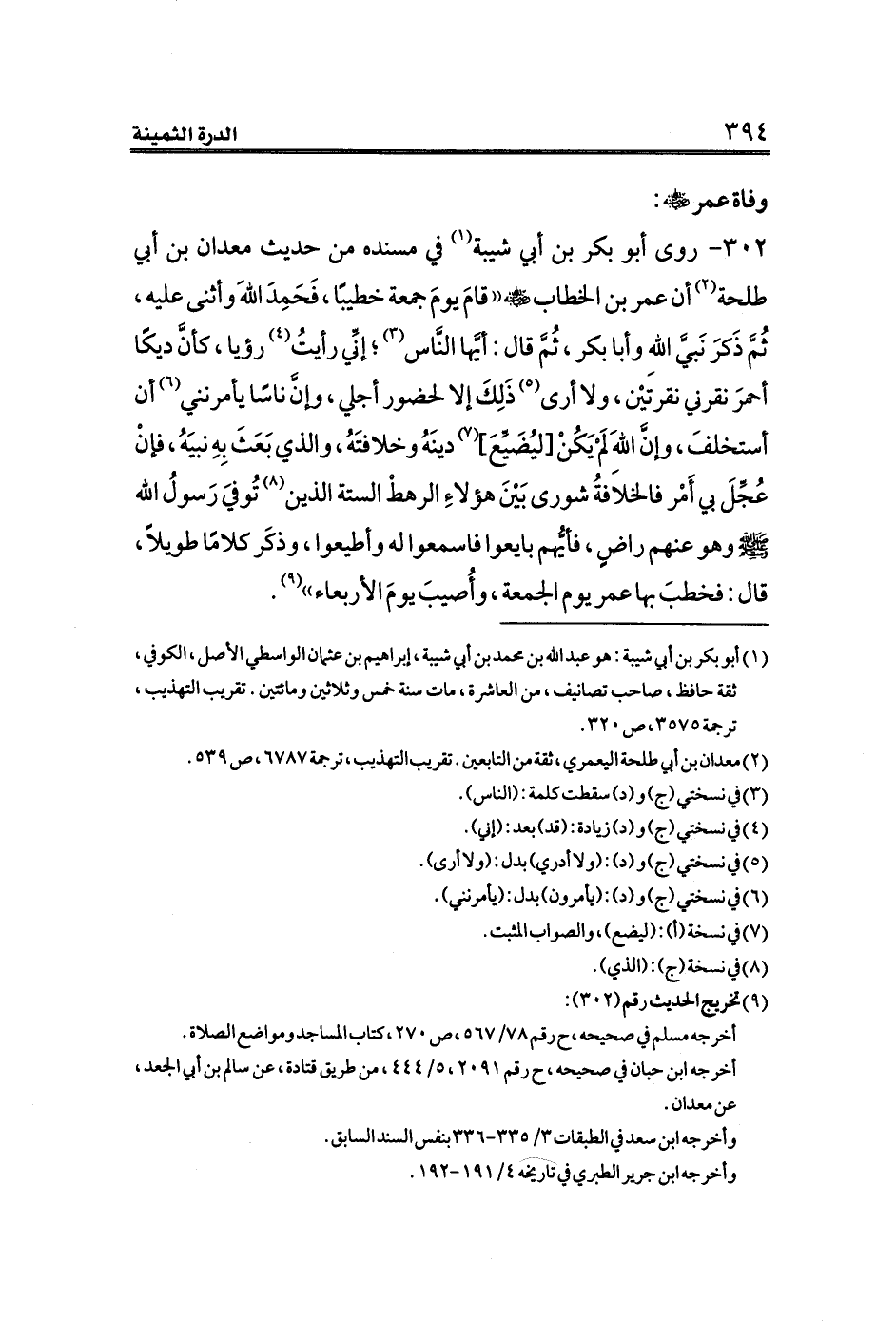 ٣٠٢ - روى أبو بكر بن أبي شيبة (¬١) في مسنده من حديث معدان بن أبي طلحة (¬٢) أن عمر بن الخطاب - رضي الله عنه - ((قامَ يومَ جمعة خطيبًا، فَحَمِدَ اللهَ وأثنى عليه، ثُمَّ ذَكرَ نَبيَّ اللهِ وأبا بكر، ثُمَّ قال: أيَّها النَّاس (¬٣)؛ إنِّي رأيتُ (¬٤) رؤيا، كأنَّ ديكًا أحمرَ نقرني نقرتيْن، ولا أرى (¬٥) ذَلِكَ إلا لحضور أجلي، وإنَّ ناسًا يأمرنني (¬٦) أن أستخلفَ، وإنَّ اللهَ لَمْ يَكُنْ [ليُضَيِّعَ] (¬٧) دينَهُ وخلافتَهُ، والذي بَعَثَ بِهِ نبيَهُ، فإنْ عُجِّلَ بي أَمْر فالخلافةُ شورى بَيْنَ هؤلاءِ الرهطْ الستة الذين (¬٨) تُوفيَ رَسولُ الله - صلى الله عليه وسلم - وهو عنهم راضٍ، فأيُّهم بايعوا فاسمعوا له وأطيعوا، وذكَر كلامًا طويلاً، قال: فخطبَ بها عمر يوم الجمعة، وأُصيبَ يومَ الأربعاء)) (¬٩).