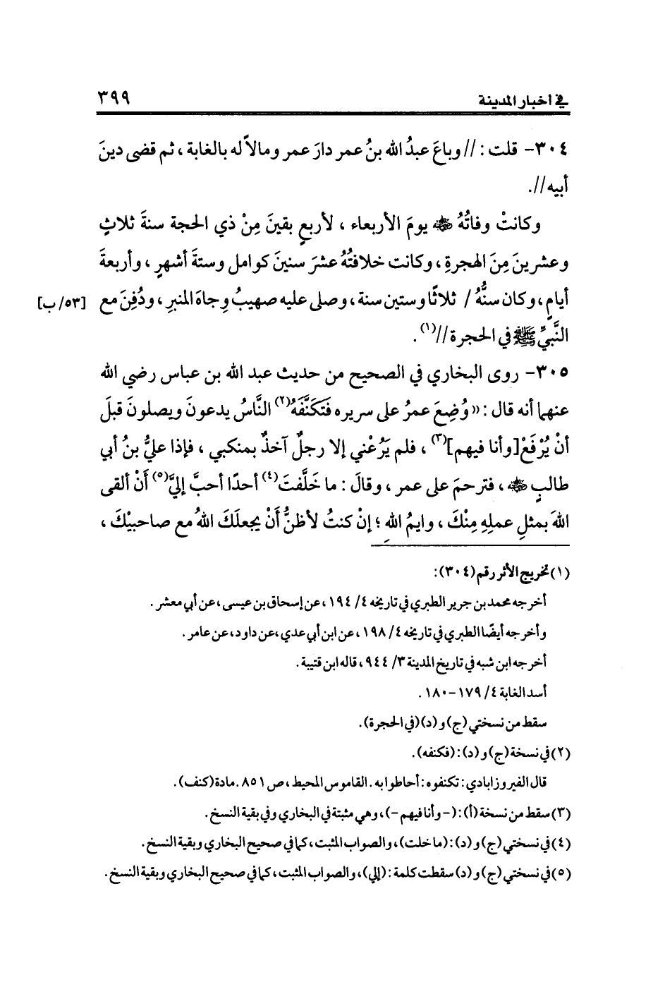 ٣٠٤ - قلت: // وباعَ عبدُ الله بنُ عمر دارَ عمر ومالاً له بالغابة، ثم قضى دينَ