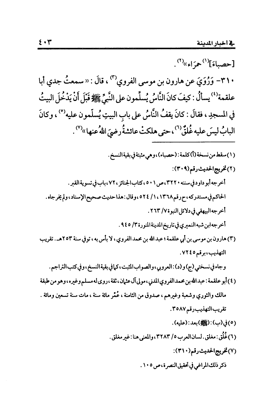 ٣١٠ - وَرُوَيَ عن هارون بن موسى الفروي (¬٣)، قالَ: ((سمعتُ جدي أبا علقمة (¬٤) يسألُ: كيفَ كانَ النَّاسُ يُسلِّمون على النَّبيِّ - صلى الله عليه وسلم - قَبْلَ أَنْ يَدْخُلَ البيتُ في المسجدِ، فقالَ: كانَ يقفُ النَّاسُ على بابِ البيتِ يُسلّمون عليه (¬٥)، وكانَ البابُ ليسَ عليه غُلقٌ (¬٦)، حتى هلكتْ عائشةُ رضيَ اللهُ عنها)) (¬٧).