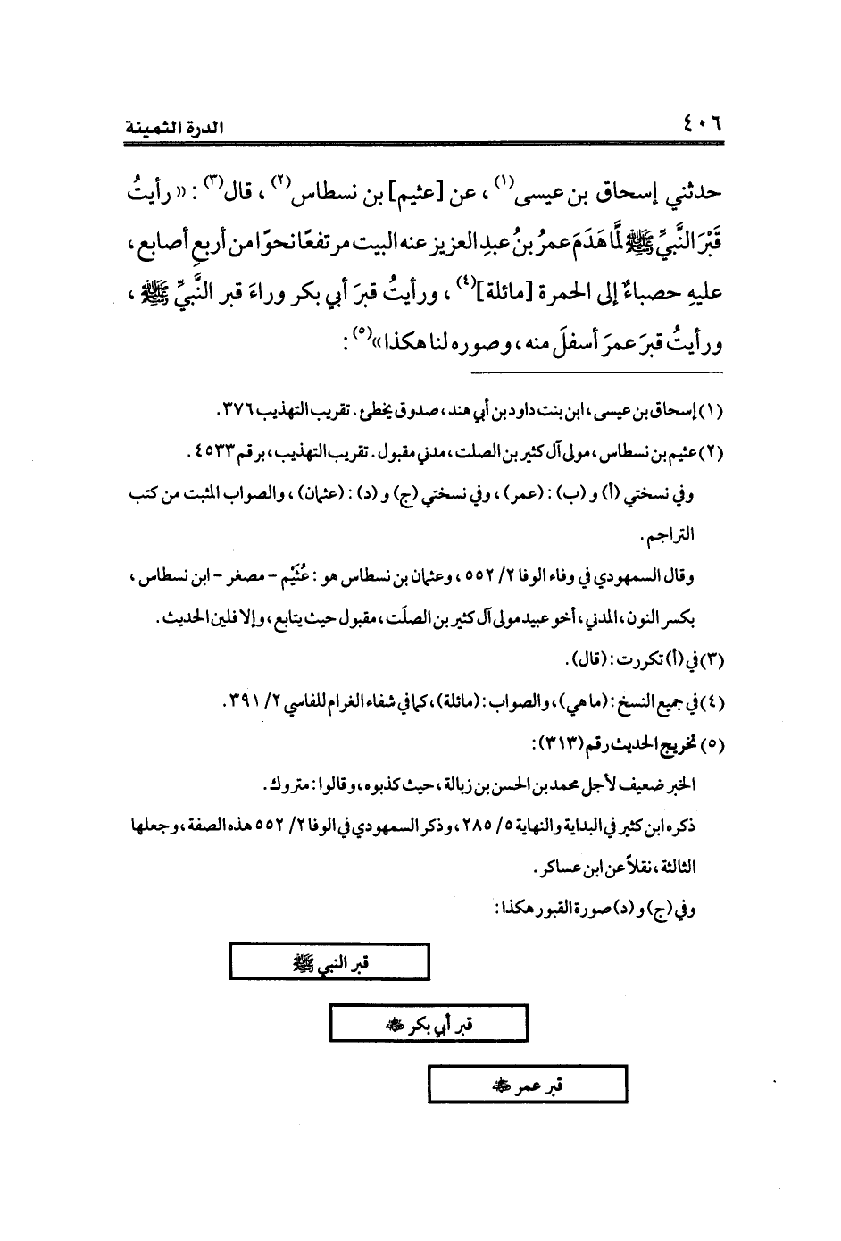 حدثني إسحاق بن عيسى (¬١)، عن [عثيم] بن نسطاس (¬٢)، قال (¬٣): ((رأيتُ قَبْرَ النَّبيِّ صلى الله عليه وسلم لَمَّا هَدَمَ عمرُ بنُ عبدِ العزيز عنه البيت مرتفعًا نحوًا من أربعِ أصابع، عليهِ حصباءٌ إلى الحمرة [مائلة] (¬٤)، ورأيتُ قبرَ أبي بكر وراءَ قبر النَّبيِّ صلى الله عليه وسلم، ورأيتُ قبرَ عمرَ أسفلَ منه، وصوره لنا هكذا)) (¬٥):