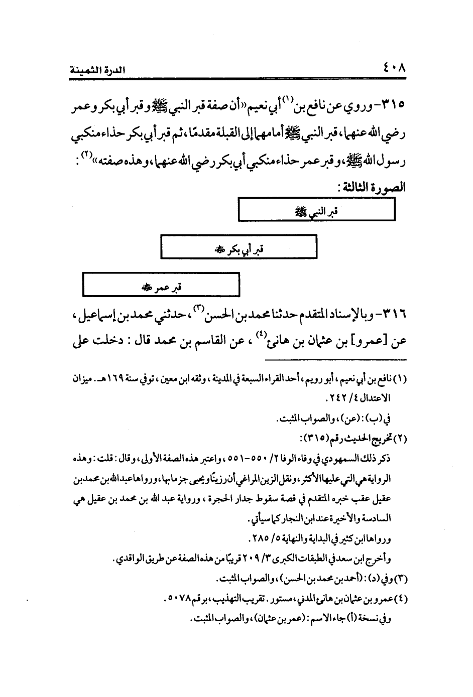 ٣١٥ - وروي عن نافع بن (¬١) أبي نعيم ((أن صفة قبر النبي الله صلى الله عليه وسلم وقبر أبي بكر وعمر رضي الله عنهما، قبر النبي الله صلى الله عليه وسلم أمامهما إلى القبلة مقدمًا، ثم قبر أبي بكر حذاء منكبي رسول الله صلى الله عليه وسلم، وقبر عمر حذاء منكبي أبي بكر رضي الله عنهما، وهذه صفته)) (¬٢):