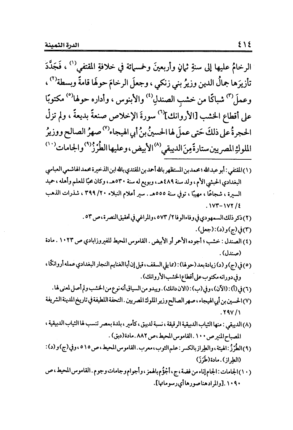 الرخامُ عليها إلى سنةِ ثمانٍ وأربعينَ وخمسمائة في خلافةِ المقتفي (¬١)، فَجَدَّدَ تأزيرَها جمالُ الدين وزيرُ بني زنكي، وجعلَ الرخامَ حولَها قامةً وبسطة (¬٢)، وعملَ (¬٣) شباكًا من خشبِ الصندلِ (¬٤) والأبنوس، وأداره حولها (¬٥) مكتوبًا على أقطاع الخشب [الأروانك] (¬٦) سورةَ الإخلاص صنعةً بديعةً، ولم تزلْ الحجرةُ على ذلكَ حَتى عملَ لها الحسينُ بنُ أبي الهيجاء (¬٧) صهرُ الصالح ووزيرُ الملوكِ المصريين ستارةً مِنَ الديبقي (¬٨) الأبيض، وعليها الطُرْزُ (¬٩) والجامات (¬١٠)