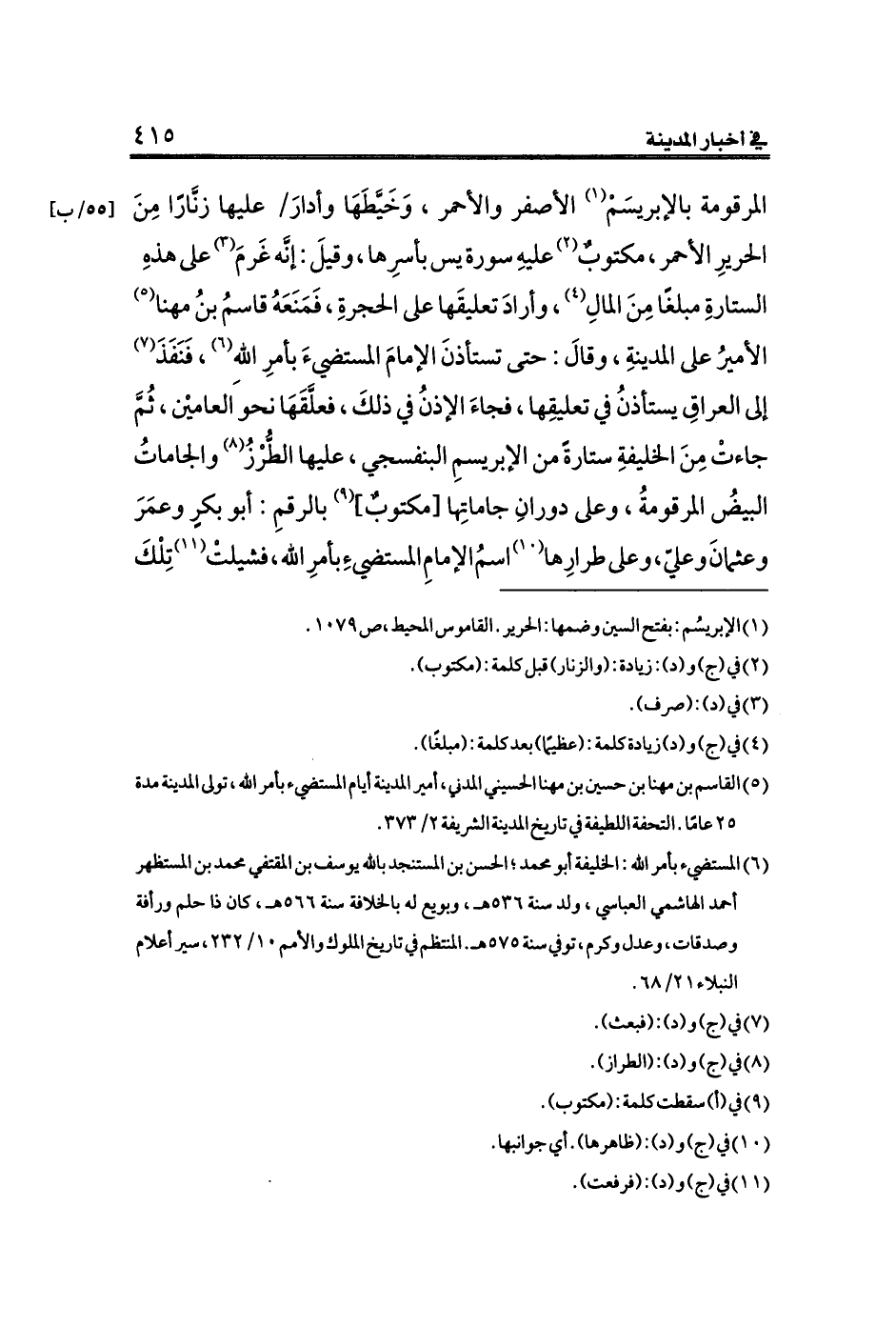 المرقومة بالإبريسَمْ (¬١) الأصفر والأحمر، وَخَيَّطَهَا وأدارَ [٥٥/ب] عليها زنَّارًا مِنَ الحريرِ الأحمر، مكتوبٌ (¬٢) عليهِ سورة يس بأسرِها، وقيلَ: إنَّه غَرمَ (¬٣) على هذهِ الستارةِ مبلغًا مِنَ المالِ (¬٤)، وأرادَ تعليقَها على الحجرةِ، فَمَنَعَهُ قاسمُ بنُ مهنا (¬٥) الأميرُ على المدينةِ، وقالَ: حتى تستأذنَ الإمامَ المستضيءَ بأمرِ اللهِ (¬٦)، فَنَفَذَ (¬٧) إلى العراقِ يستأذنُ في تعليقِها، فجاءَ الإذنُ في ذلكَ، فعلَّقَهَا نحو العاميْن، ثُمَّ جاءتْ مِنَ الخليفةِ ستارةً من الإبريسمِ البنفسجي، عليها الطُّرْزُ (¬٨) والجاماتُ البيضُ المرقومةُ، وعلى دورانِ جاماتِها [مكتوبٌ] (¬٩) بالرقمِ: أبو بكرٍ وعمَرَ وعثمانَ وعليّ، وعلى طرارِها (¬١٠) اسمُ الإمامِ المستضيءِ بأمرِ الله، فشيلتْ (¬١١) تِلْكَ