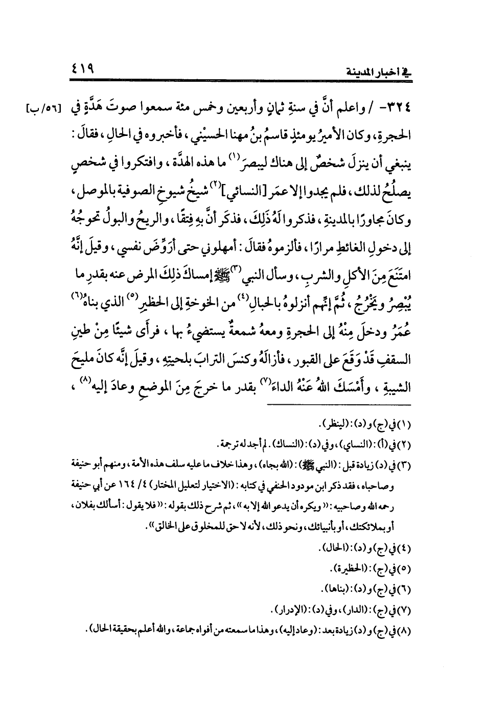 ٣٢٤ - [٥٦/ب] واعلم أنَّ في سنةِ ثمانٍ وأربعين وخمس مئة سمعوا صوتَ هَدَّةٍ في الحجرةِ، وكان الأميرُ يومئذٍ قاسمُ بنُ مهنا الحسيْني، فأخبروه في الحالِ، فقالَ: ينبغي أن ينزلَ شخصٌ إلى هناك ليبصرَ (¬١) ما هذه الهدَّة، وافتكروا في شخصٍ يصلُحُ لذلك، فلم يجدوا إلا عمَر [النسائي] (¬٢) شيخُ شيوخِ الصوفية بالموصل، وكانَ مجاورًا بالمدينةِ، فذكروا لَهُ ذَلِكَ، فذكَر أنَّ بهِ فِتقًا، والريحُ والبولُ تحوجُهُ إلى دخولِ الغائطِ مرارًا، فألزموهُ فقالَ: أمهلوني حتى أرَوِّضَ نفسي، وقيلَ إنَّهُ امتَنَعَ مِنَ الأكلِ والشربِ، وسأل النبي (¬٣) صلى الله عليه وسلم إمساكَ ذلِكَ المرض عنه بقدرِ ما يُبْصِرُ ويَخْرُجُ، ثُمَّ إنِّهم أنزلوهُ بالحبالِ (¬٤) من الخوخةِ إلى الحظيرِ (¬٥) الذي بناهُ (¬٦) عُمَرُ ودخلَ مِنْهُ إلى الحجرةِ ومعهُ شمعةٌ يستضيءُ بها، فرأَى شيئًا مِنْ طينِ السقفِ قَدْ وَقَعَ على القبور، فأزالَهُ وكنسَ الترابَ بلحيتِهِ، وقيلَ إنَّه كانَ مليحَ الشيبةِ، وأَمْسَكَ اللهُ عَنْهُ الداءَ (¬٧) بقدر ما خرجَ مِنَ الموضعِ وعادَ إليه (¬٨)،