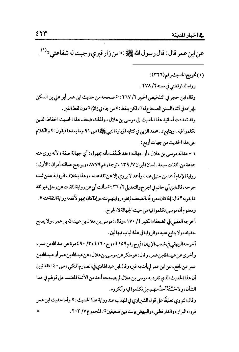 وقد تعددت أسانيد هذا الحديث إلى موسى بن هلال، ولذلك ضعف هذا الحديث الحفاظ الذين تكلموا فيه. ويتابع د. محمد الزين في كتابه (زيارة النبي صلى الله عليه وسلم) ص ٩١ وما بعدها فيقول: ((والكلام على هذا الحديث من جهات أربع: