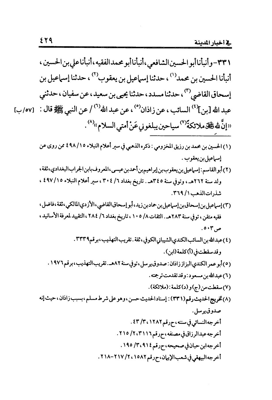٣٣١ - وأنبأنا أبو الحسين الشافعي، أنبأنا أبو محمد الفقيه، أنبأنا علي بن الحسين، أنبأنا الحسين بن محمد (¬١)، حدثنا إسماعيل بن يعقوب (¬٢)، حدثنا إسماعيل بن إسحاق القاضي (¬٣)، حدثنا مسدد، حدثنا يحيى بن سعيد، عن سفيان، حدثني عبد الله [بن] (¬٤) السائب، عن زاذان (¬٥)، عن عبد الله (¬٦) [٥٧/ب] عن النبي الله صلى الله عليه وسلم قال: ((إنَّ للهِ - عز وجل - ملائكةً (¬٧) سياحين يبلغوني عَنْ أمتي السلام)) (¬٨).