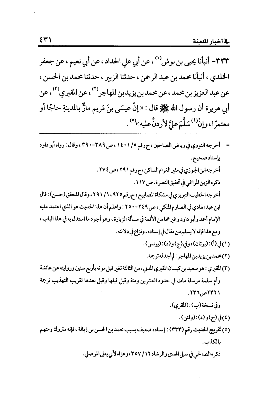 ٣٣٣ - أنبأنا يحيى بن بوش (¬١)، عن أبي علي الحداد، عن أبي نعيم، عن جعفر الخلدي، أنبأنا محمد بن عبد الرحمن، حدثنا الزبير، حدثنا محمد بن الحسن، عن عبد العزيز بن محمد، عن محمد بن يزيد بن المهاجر (¬٢)، عن المقبري (¬٣)، عن أبي هريرة أن رسول الله صلى الله عليه وسلم قال: ((إنّ عيسَى بنَ مَريم مارٌّ بالمدينةِ حاجًا أو معتمرًا، وإنْ (¬٤) سَلَّمَ عليَّ لأردنَّ عليه)) (¬٥).