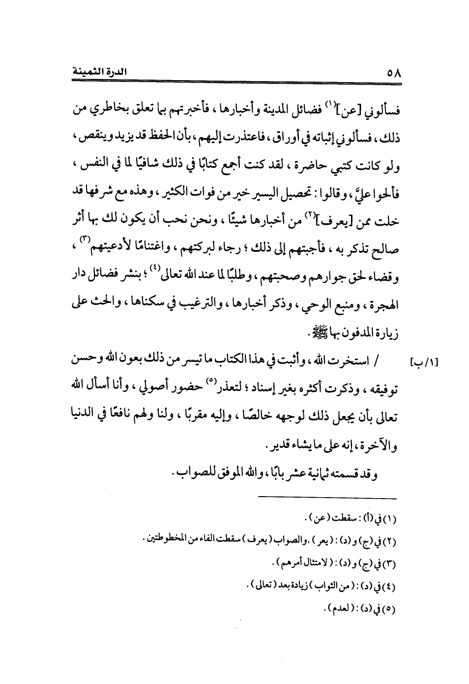 فسألوني [عن] (¬١) فضائل المدينة وأخبارها، فأخبرتهم بما تعلق بخاطري من ذلك، فسألوني إثباته في أوراق، فاعتذرت إليهم، بأن الحفظ قد يزيد وينقص، ولو كانت كتبي حاضرة، لقد كنت أجمع كتابًا في ذلك شافيًا لما في النفس، فألحوا عليَّ، وقالوا: تحصيل اليسير خير من فوات الكثير، وهذه مع شرفها قد خلت ممن [يعرف] (¬٢) من أخبارها شيئًا، ونحن نحب أن يكون لك بها أثر صالح تذكر به، فأجبتهم إلى ذلك؛ رجاء لبركتهم، واغتنامًا لأدعيتهم (¬٣)، وقضاء لحق جوارهم وصحبتهم، وطلبًا لما عند الله تعالى (¬٤)؛ بنشر فضائل دار الهجرة، ومنبع الوحي، وذكر أخبارها، والترغيب في سكناها، والحث على زيارة المدفون بها - صلى الله عليه وسلم -.