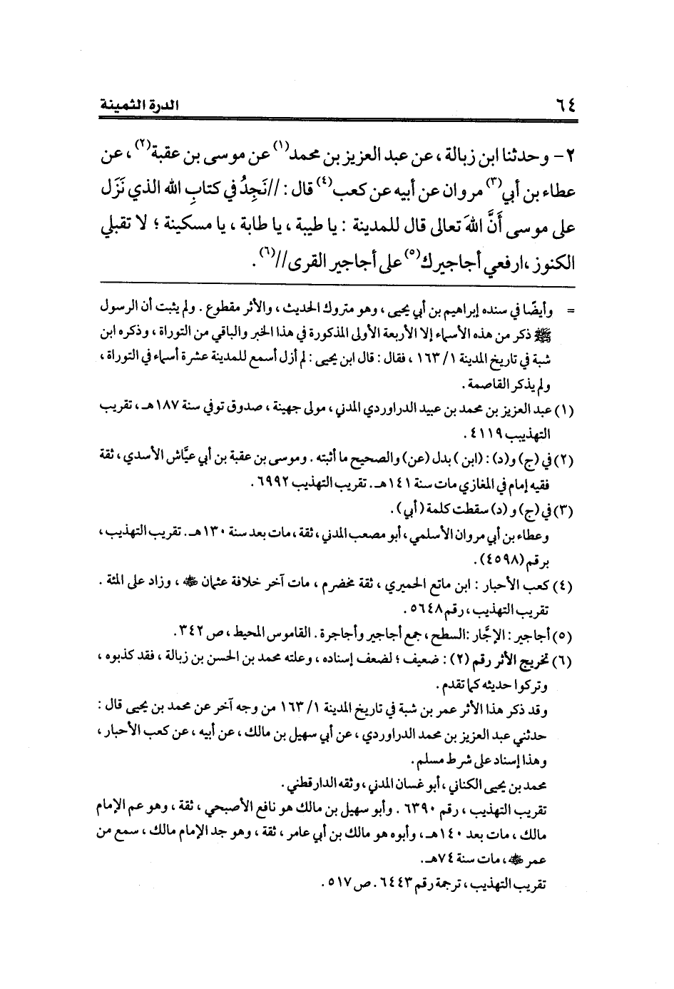 ٢ - وحدثنا ابن زبالة، عن عبد العزيز بن محمد (¬١) عن موسى بن عقبة (¬٢)، عن عطاء بن أبي (¬٣) مروان عن أبيه عن كعب (¬٤) قال: //نَجِدُ في كتابِ الله الذي نَزَل على موسى أَنَّ اللهَ تعالى قال: للمدينة يا طيبة، يا طابة، يا مسكينة لا تقبلي الكنوز، ارفعي أجاجيرك (¬٥) على أجاجير القرى// (¬٦).